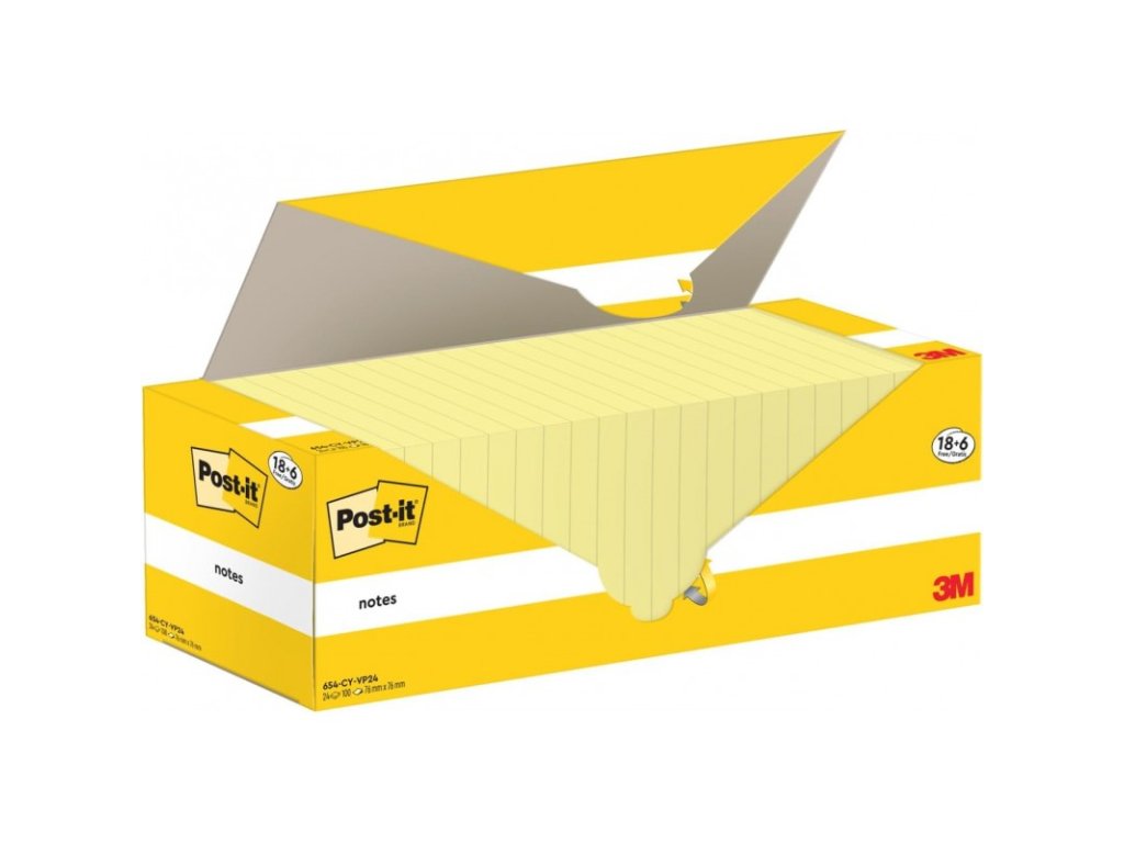 3M Post-it 654 samolepící bloček super sticky, 76x76 mm, silně lepící, 24x100 listů, kanárkově žlutá