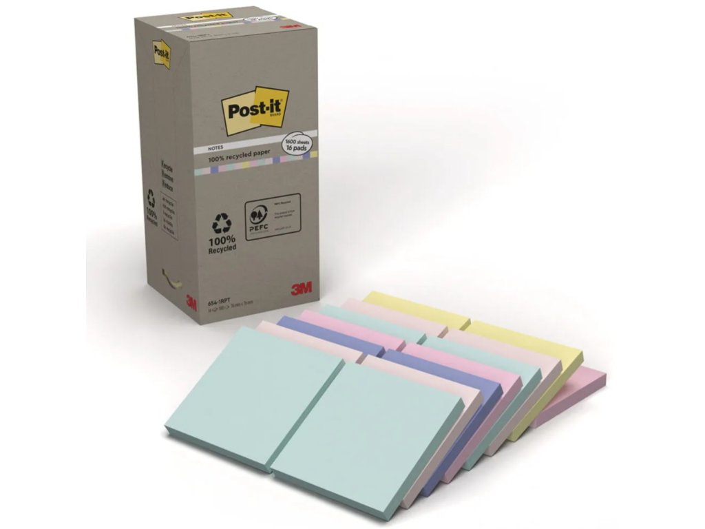 3M Post-it samolepící recyklovaný bloček 654-1RPT, rozměr 76x76 mm, 16x100 lístků, pastelové barvy