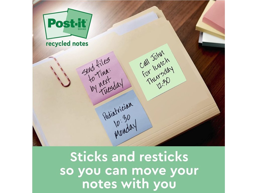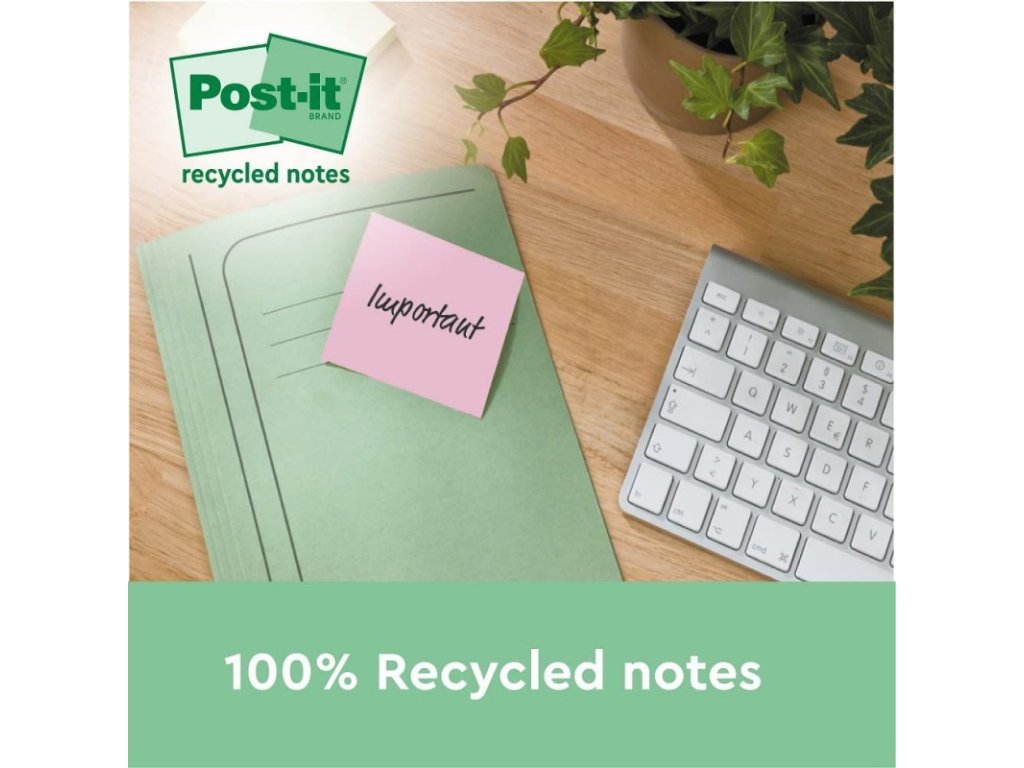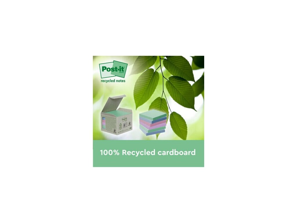 - Recyklované Post-it® Samolepicí bločky pastelových (modrá, zelená, šedivá) a žlutých barev pro opakované použití s dokonalou přilnavostí, které se nekroutí. 100% recyklovaná vlákna a obal.