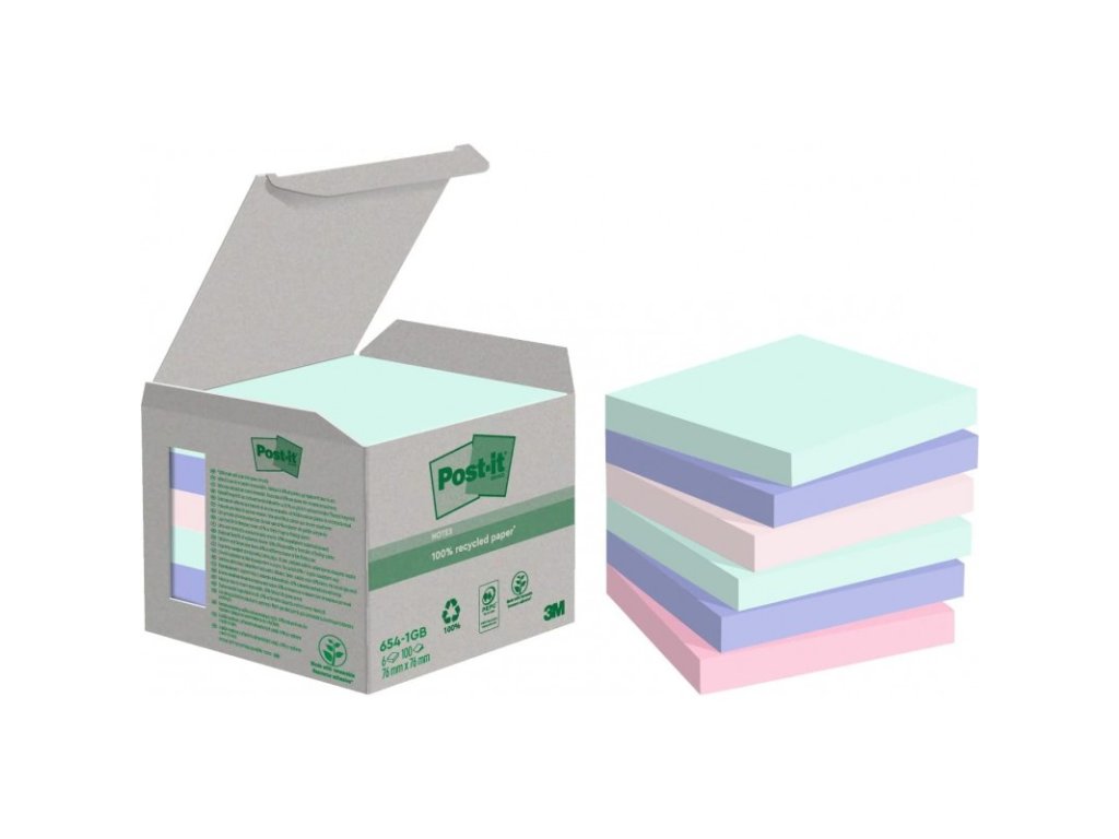 3M Post-it samolepící recyklovaný bloček pastelový 654-1GB, rozměr 76x76 mm, 6x100 lístků