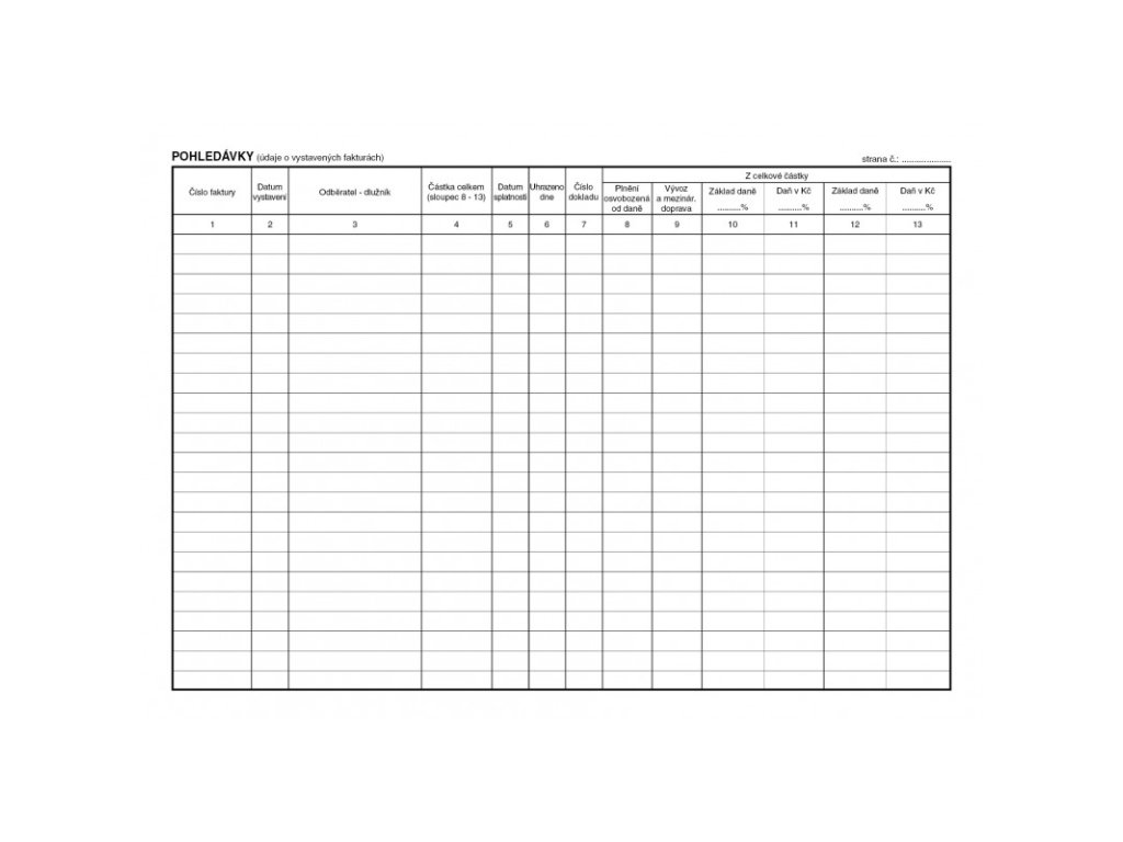 Kniha pohledávek vystavených faktur slouží k evidenci všech vystavených faktur a souvisejících pohledávek. Obsahuje 40 oboustranných stran ve vazbě V1, vyrobených z recyklovaného hlazeného papíru. Vnitřní stránky jsou tištěny černou barvou pro dobrou přehlednost.