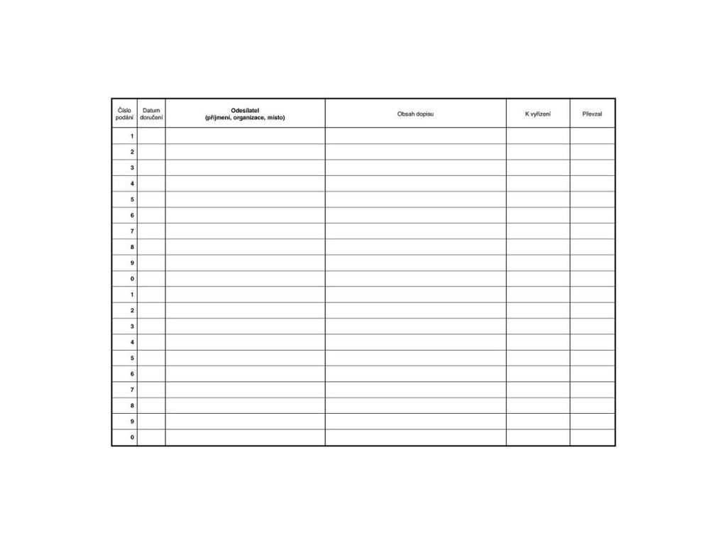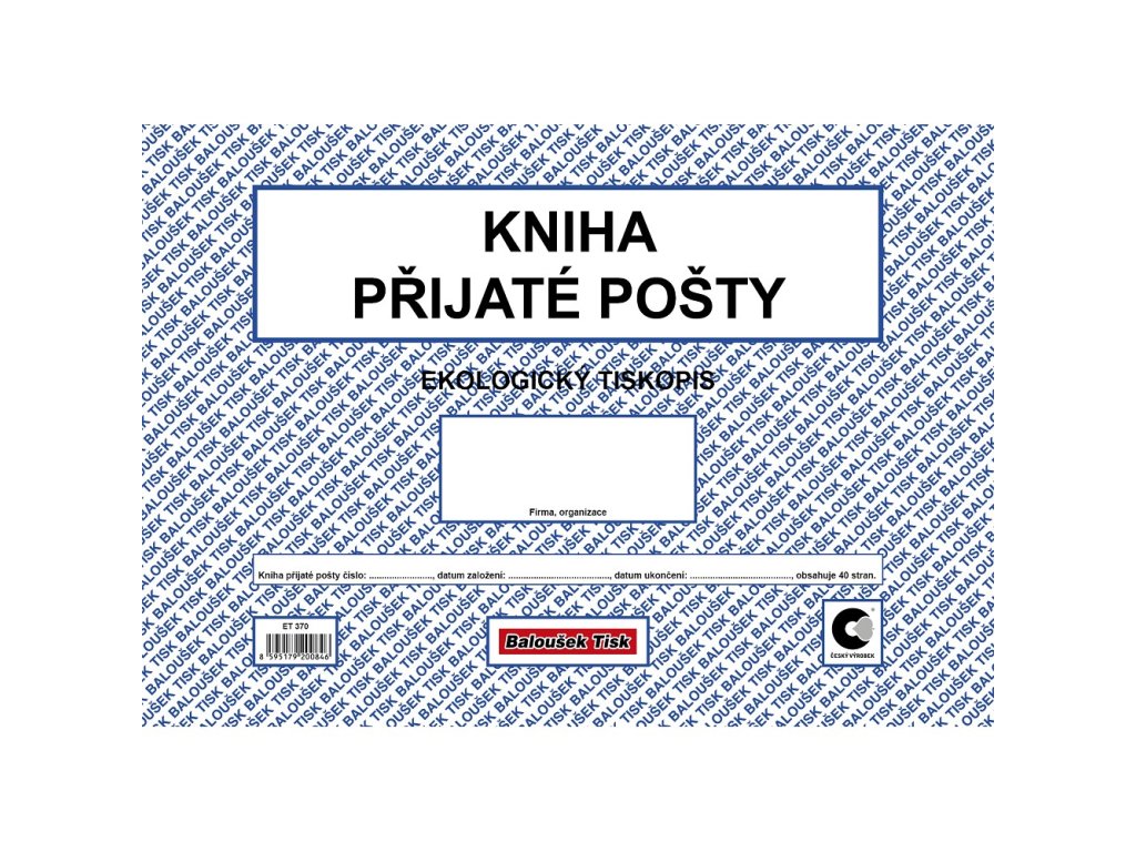 Kniha přijaté pošty slouží k evidenci veškeré příchozí korespondence v organizaci. Obsahuje 40 oboustranných stran ve vazbě V1, vyrobených z recyklovaného hlazeného papíru. Vnitřní tisk je proveden černou barvou pro maximální přehlednost.