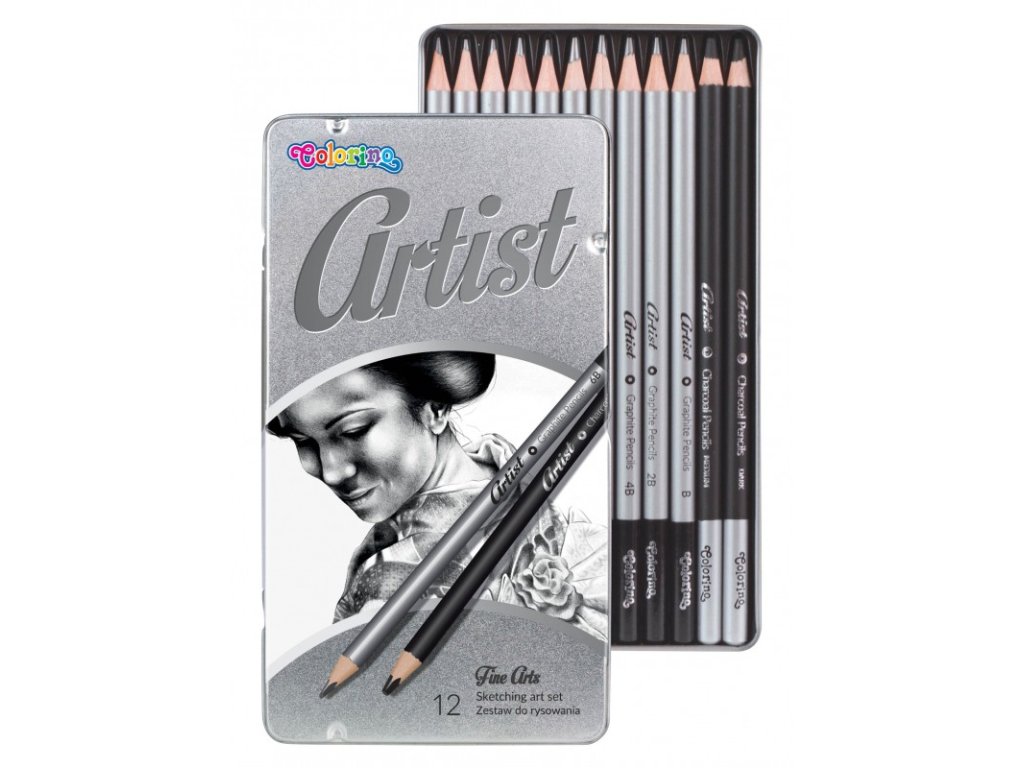 Colorino Artist kreslířská sada grafitových tužek a uhlů, kulaté, kovový box, 12 uhlů