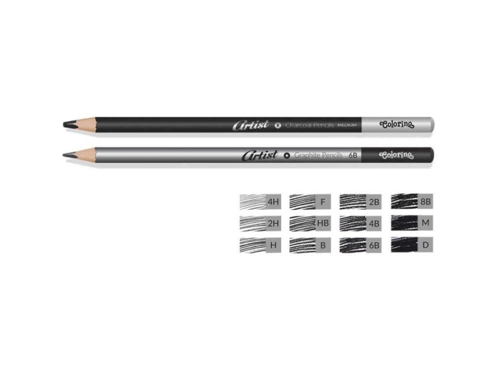 - celkem 10 tužek různých tvrdostí: B,2B,4B,6B, 8B,H, 2H, 4H, HB, F a dále měkký a tvrdý uhel