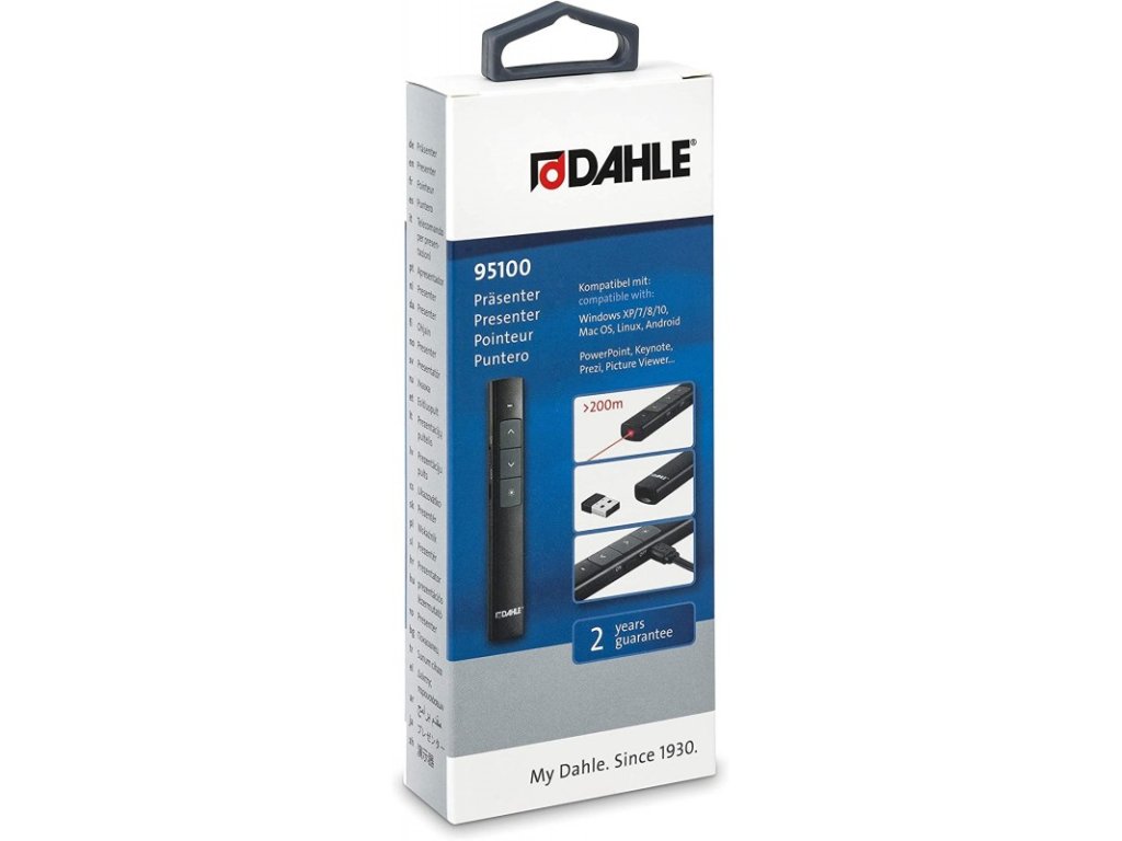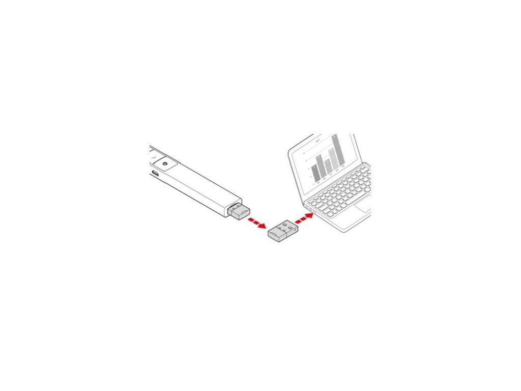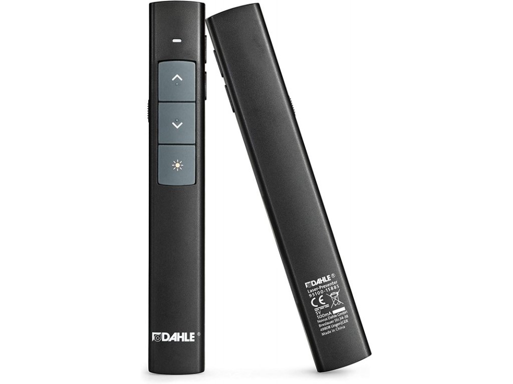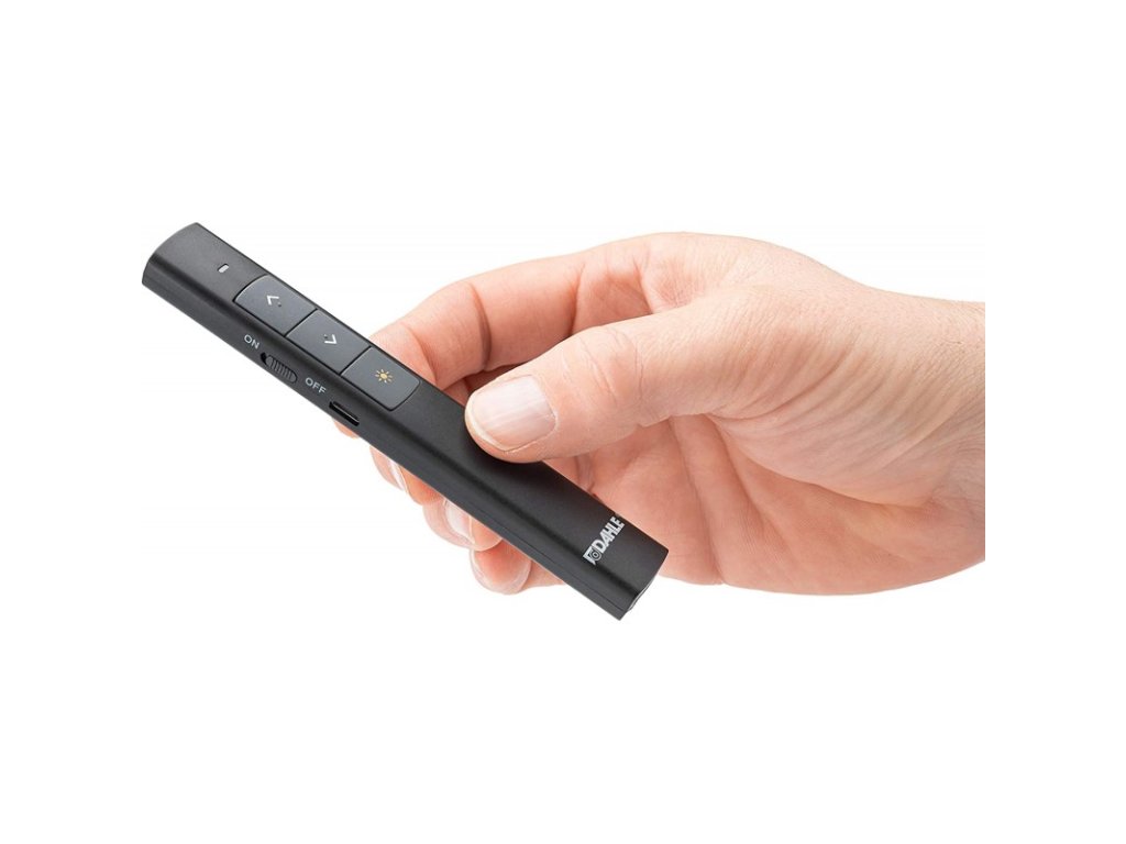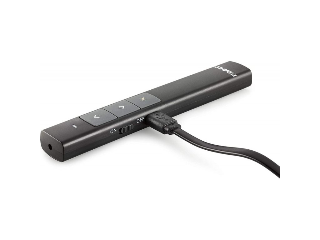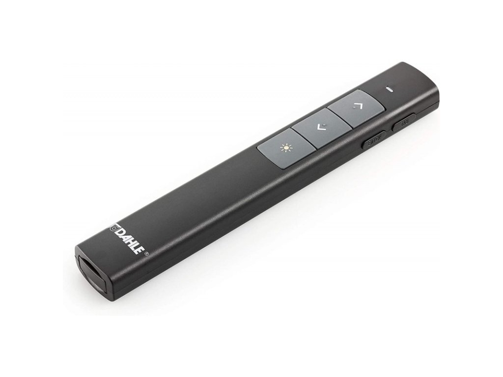 - Kombinace laserového ukazovátka a dálkového ovládání pro prezentace. Červený laser má přibližnou vzdálenost 200 m a je tedy vhodný i do velkých místností. Aby bylo možné příslušné médium ovládat, musí být do volného USB slotu zapojen USB přijímač. Přijímač je umístěn ve spodní části ukazovátka, drží pomocí magnetu a zajišťuje tedy velmi snadné používání. Ovladač má integrovanou lithium-polymerovou baterii, kterou lze nabíjet na jakémkoliv zařízení s USB portem pomocí dodaného kabelu. Po max. 2 hodinách je baterie plně nabitá a poté může být používána po delší dobu - v závislosti na použití. Modrá LED signalizuje nabití baterie.