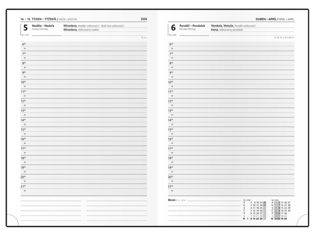 - Informační stránky: osobní údaje, přehledný kalendář 2026 a 2027, plán dovolených 2026, česká a slovenská křestní jména, daňový kalendář CZ/SK 2026, mezinárodní svátky, důležitá telefonní čísla, roční plánovací kalendář CZ/SK 2026, místo pro poznámky