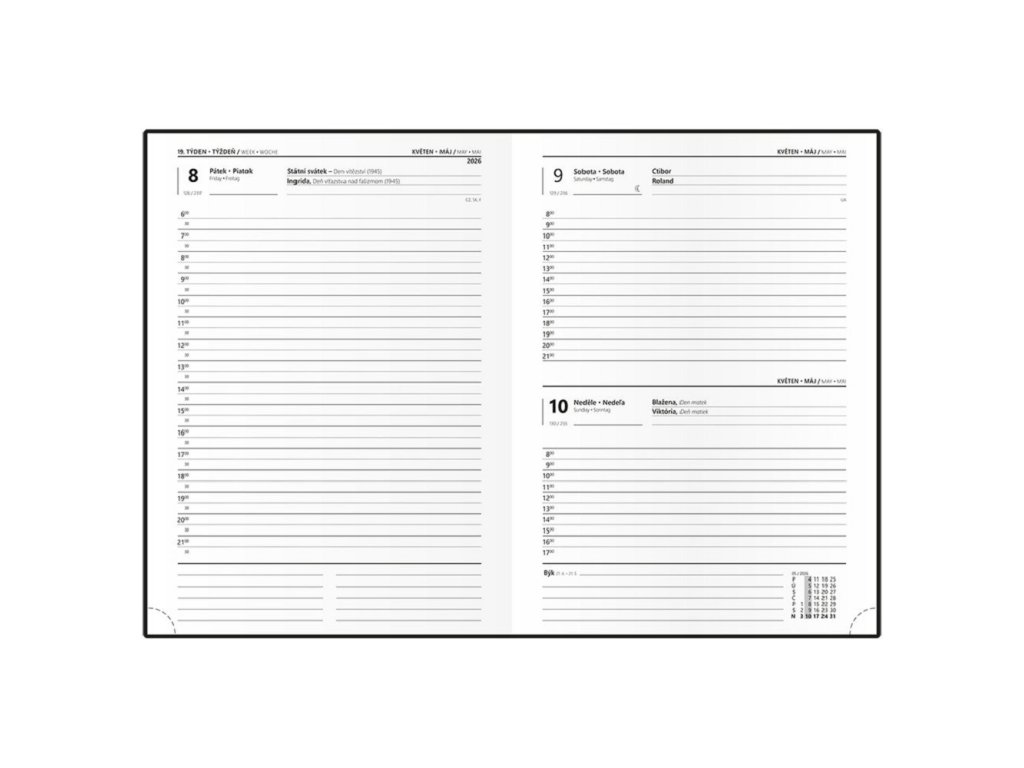 - Informační stránky: osobní údaje, přehledný kalendář 2026 a 2027, měsíční plánování 2026, plán dovolených 2026, česká a slovenská křestní jména, daňový kalendář CZ/SK 2026, mezinárodní svátky, důležitá telefonní čísla, roční plánovací kalendář CZ/SK 2026, místo pro poznámky