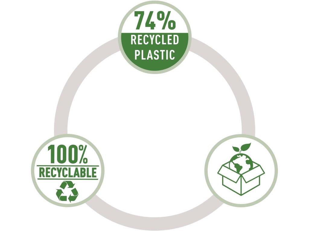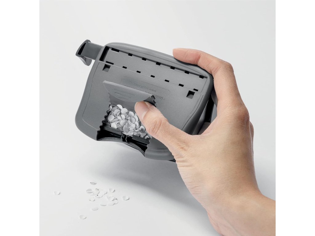 Kompaktní a přitom výkonná děrovačka vyrobená ze 100% recyklovaného průmyslového plastu, s obalem vyrobeným z recyklovaného kartonu.
