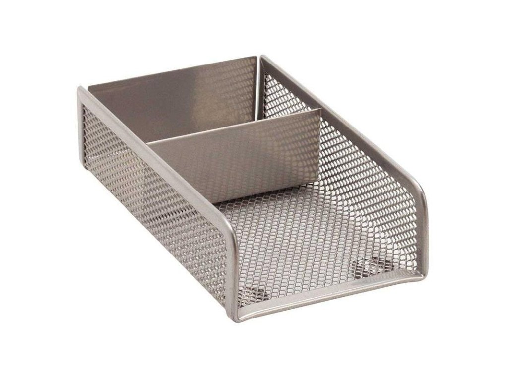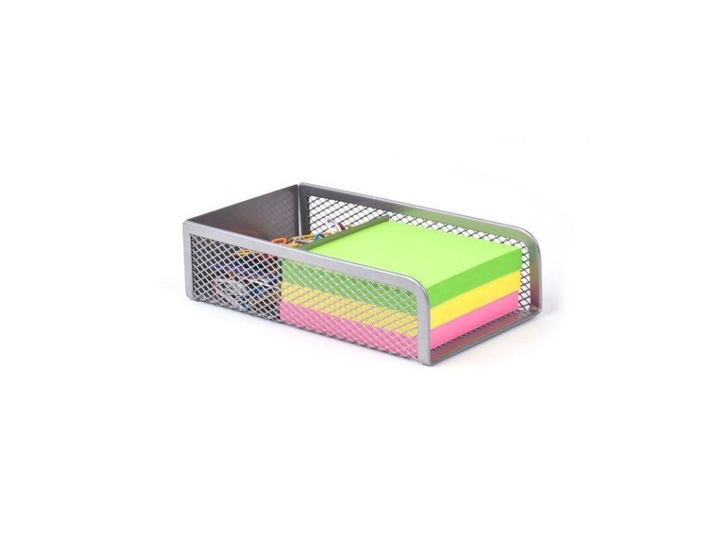 - Stříbrný kovový zásobník na poznámkové lístečky a kancelářské sponky.
