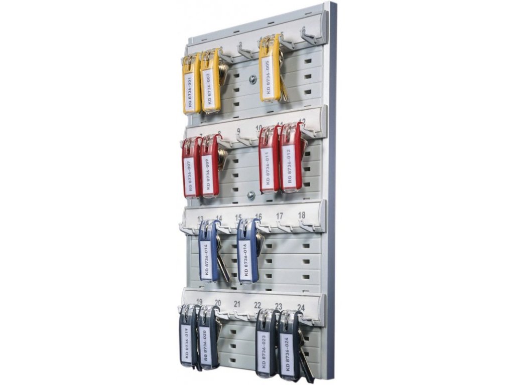 - Jednoduchý plastový panel k upevnění na stěnu se čtyřmi řadami klíčů.