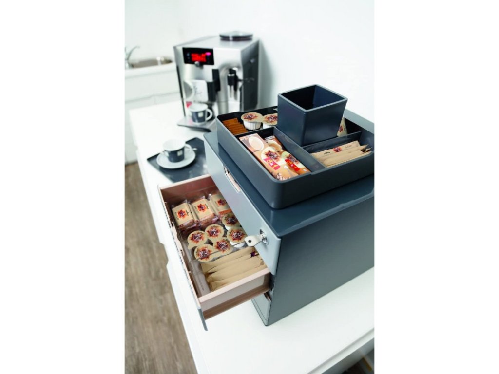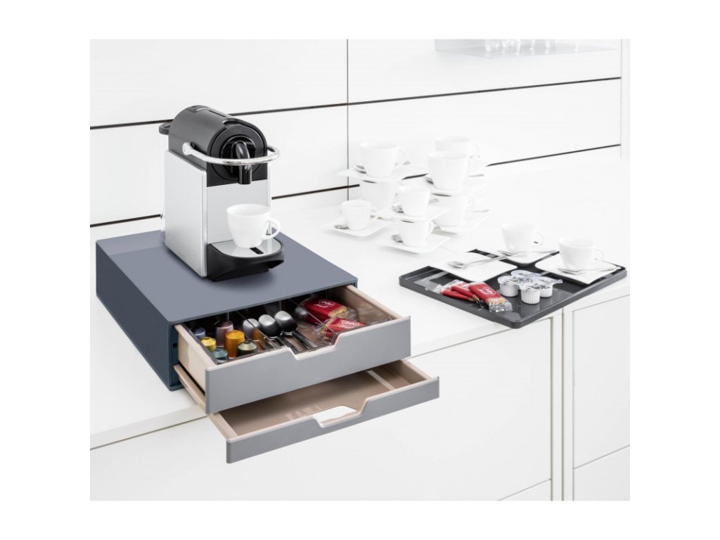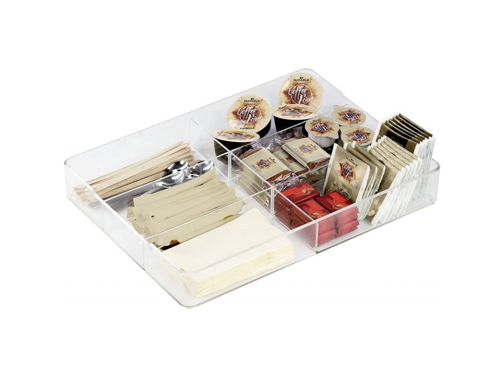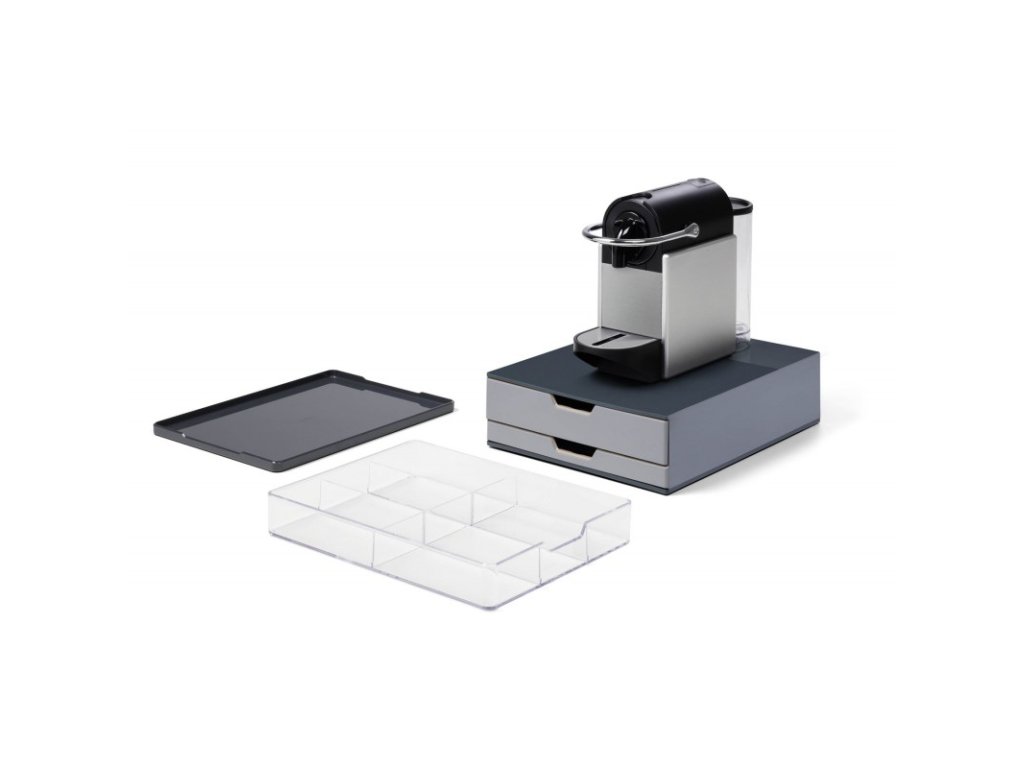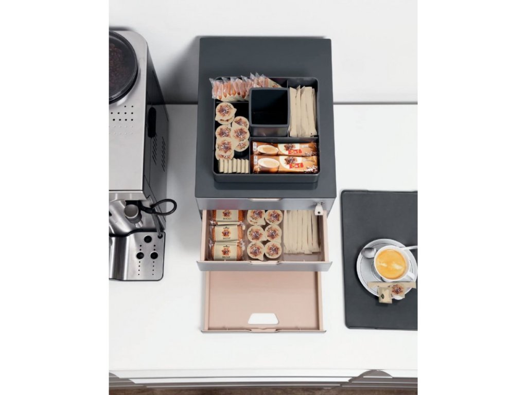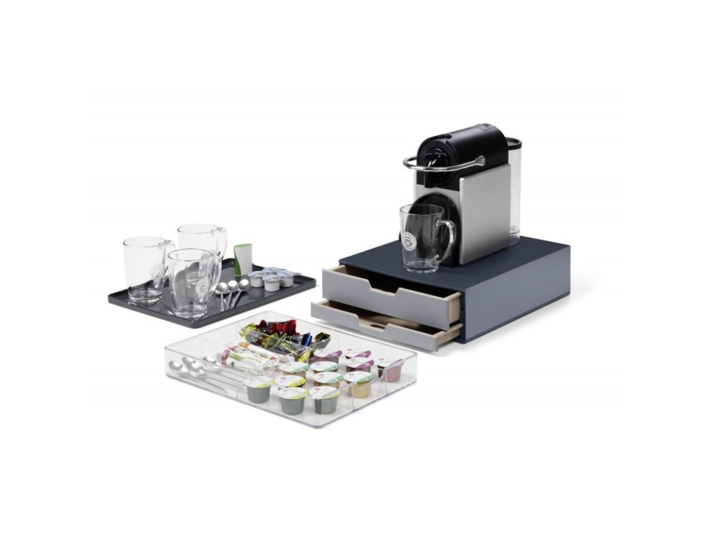 - Účinné uspořádání přihrádek, ideální pro ukládání příslušenství kávových stanic, jako jsou kávové kapsle, cukrovinky, míchací tyčinky, mléčné tobolky, čokoládové oplatky a mnoho dalšího.