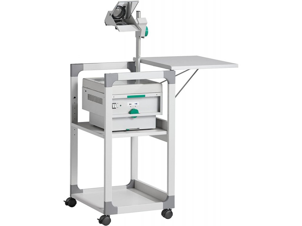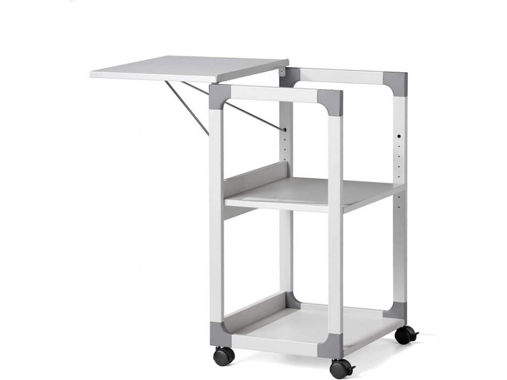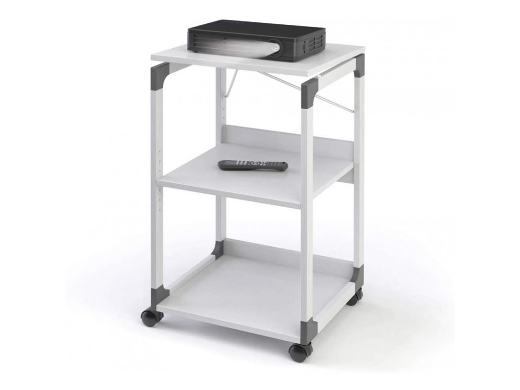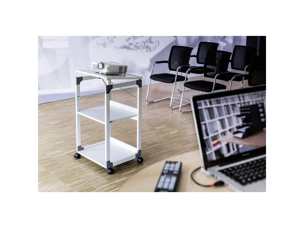 - Vozík pro projektory nebo zpětné projektory se třemi melaminem potaženými policemi o tloušťce 19 mm.