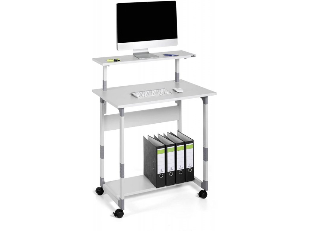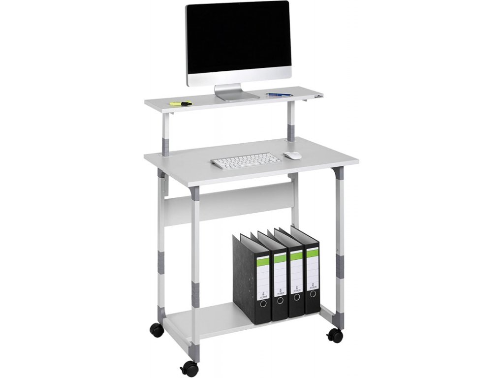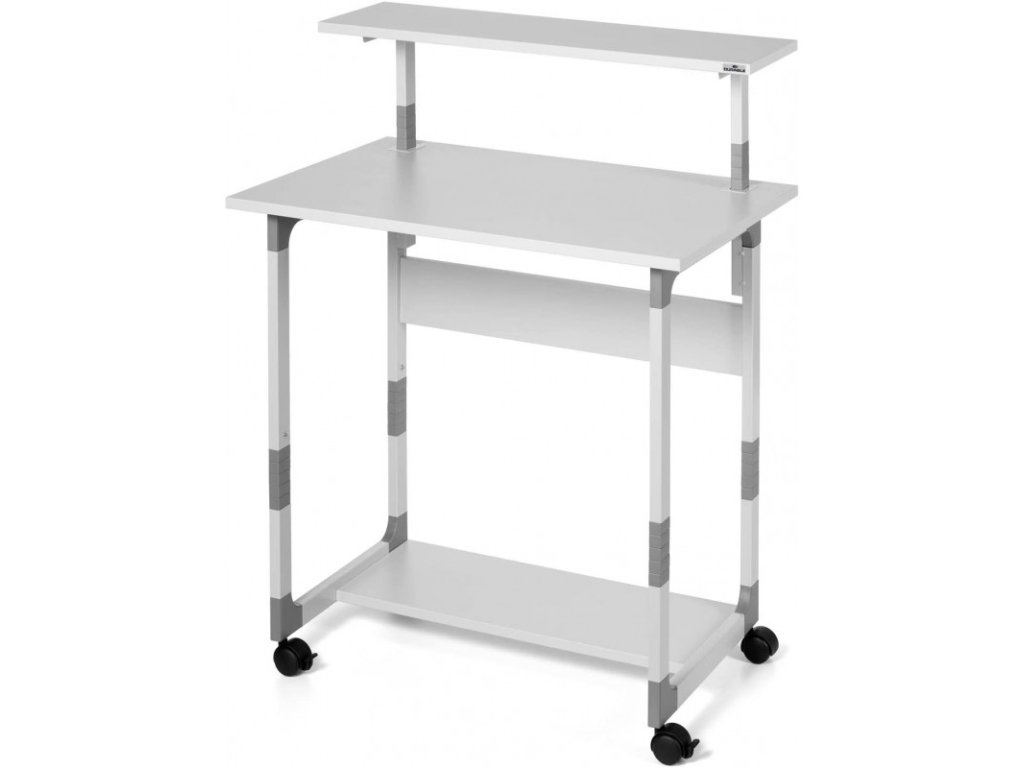 - Mobilní počítačový stůl s výškově nastavitelnou policí na monitor a s přídavnou policí na klávesnici.
