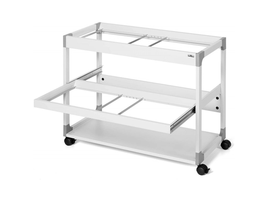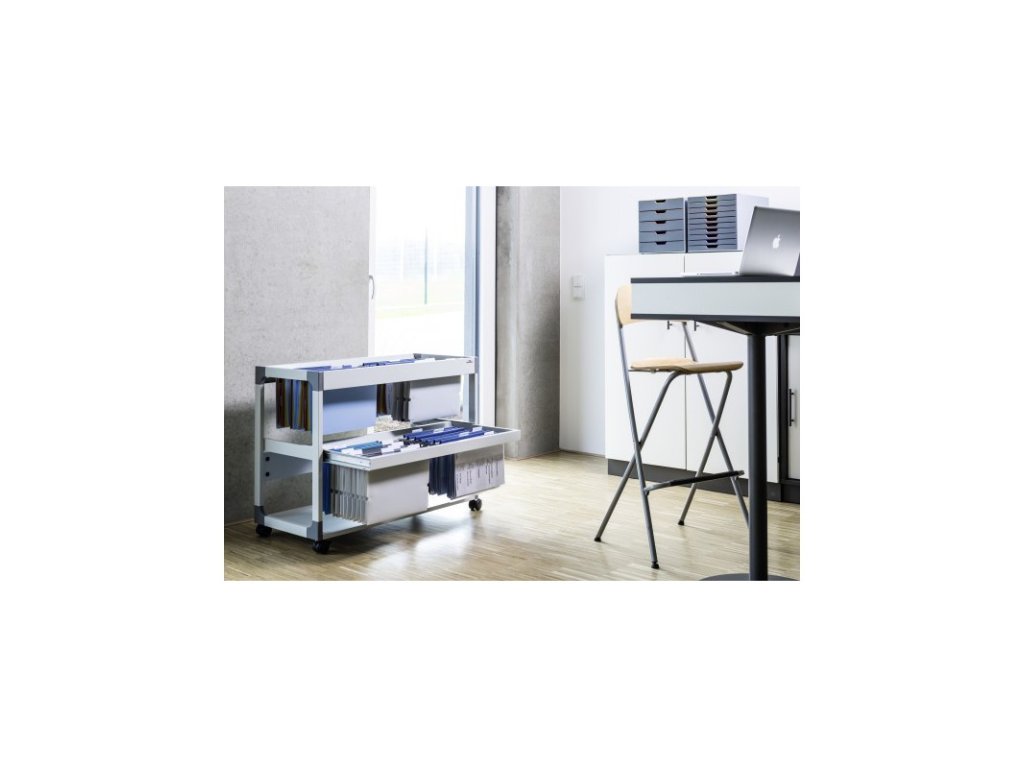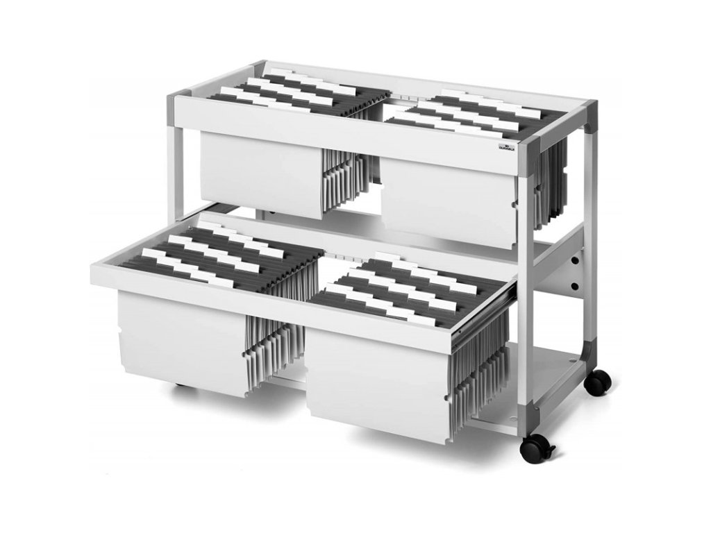- Otevřená pojízdná kartotéka pro cca 200 ks závěsných desek ve formátu A4 nebo pro deset velkých závěsných pořadačů (80 mm) nebo pro osmnáct malých závěsných pořadačů (40 mm).