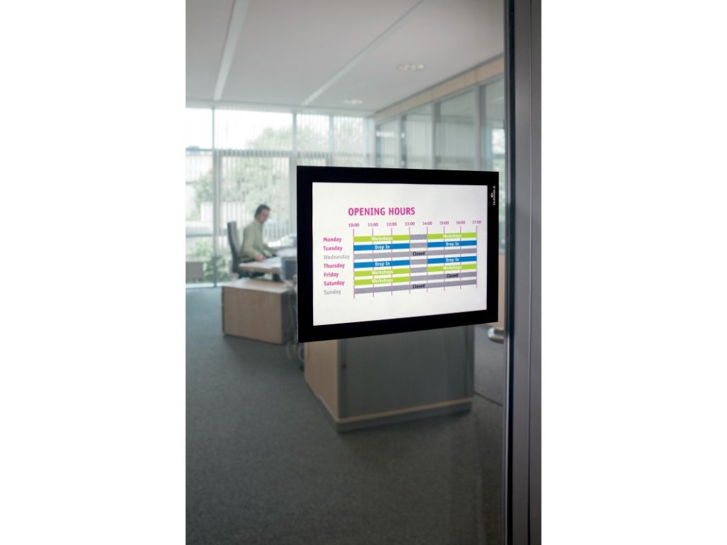 - Jednoduše umístěte na jakýkoliv hladký povrch, otevřete magnetický rámeček, vložte informační materiál a zavřete – toť vše.