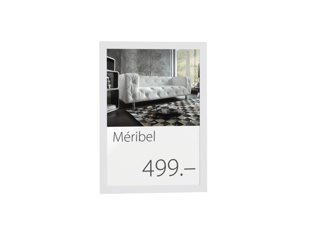 - Jednoduše umístěte na jakýkoliv hladký povrch, otevřete magnetický rámeček, vložte informační materiál a zavřete – toť vše.