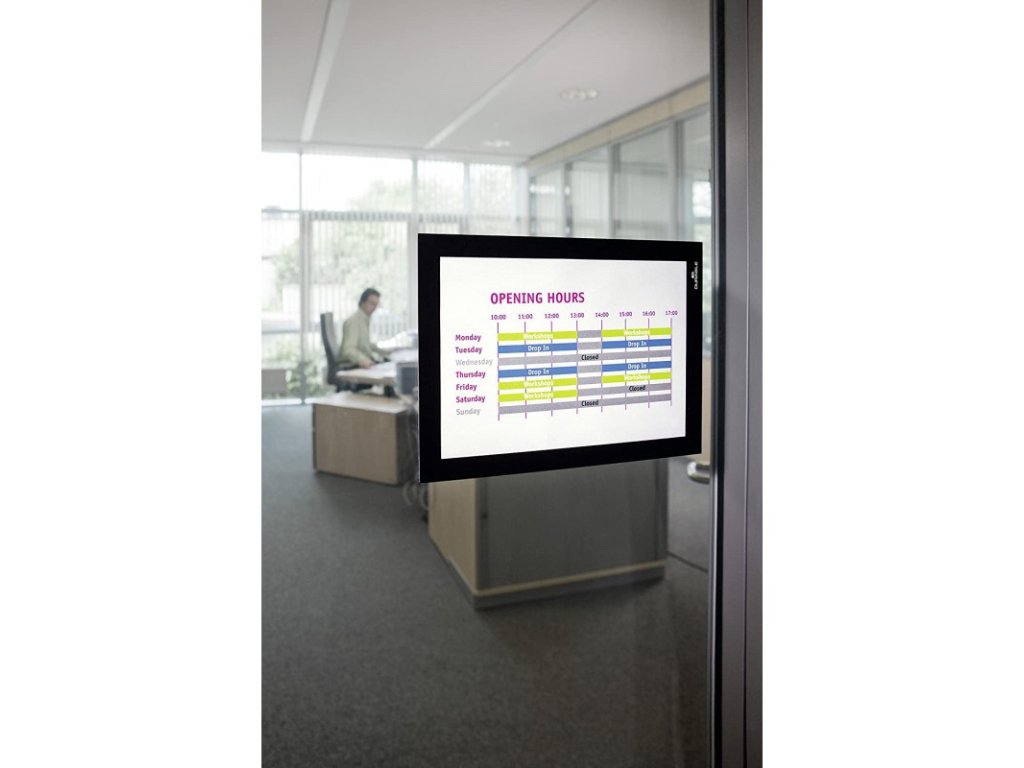 - Jednoduše umístěte na jakýkoliv hladký povrch, otevřete magnetický rámeček, vložte informační materiál a zavřete – toť vše.