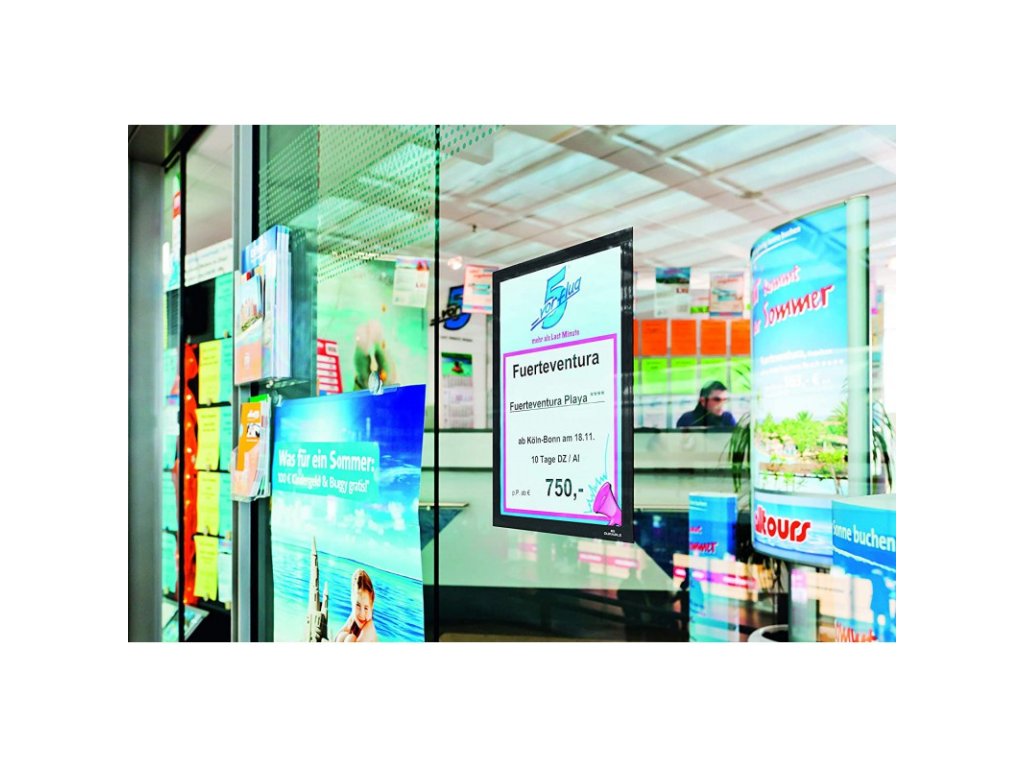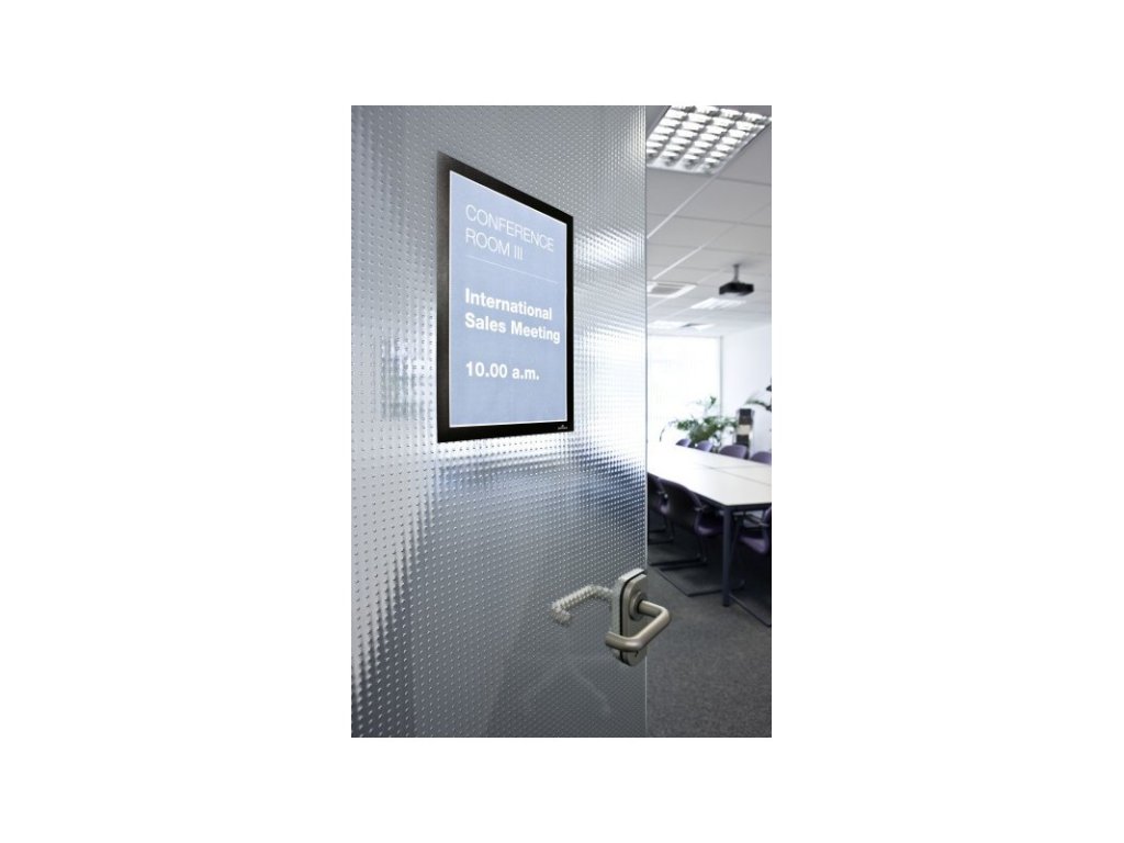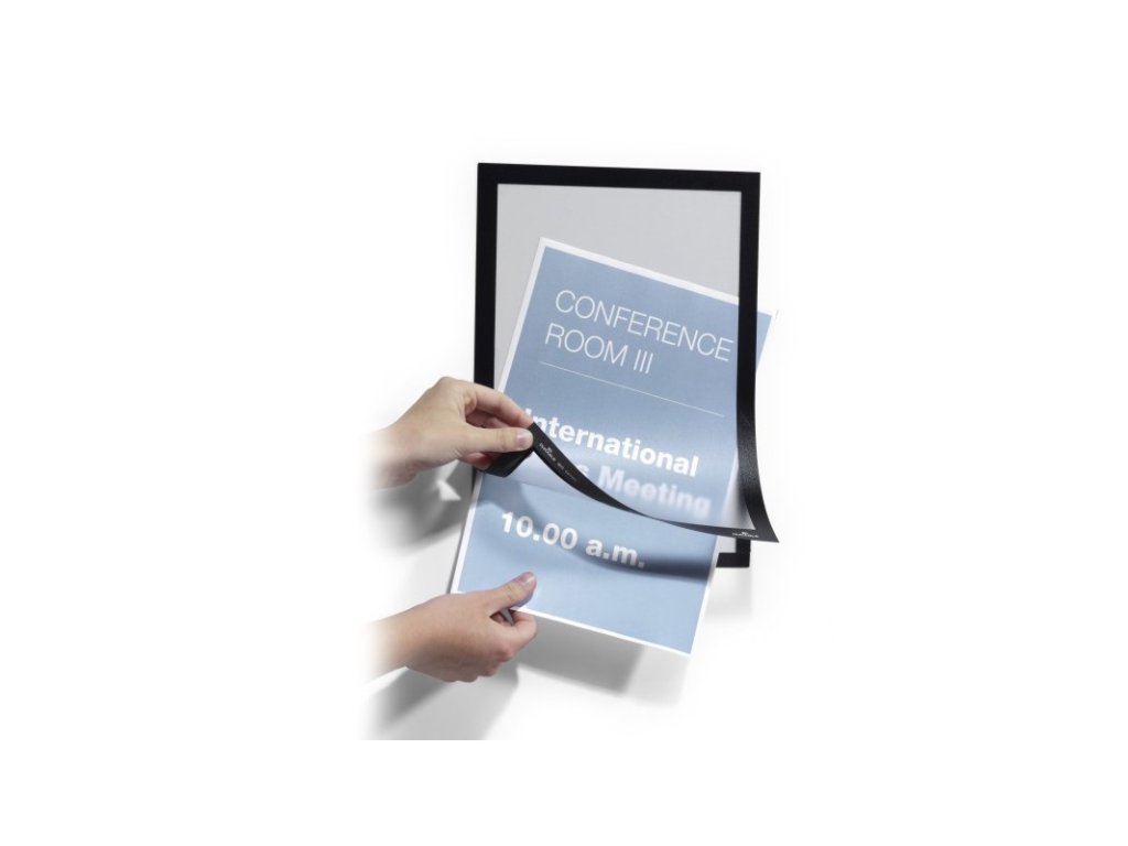 - Jednoduše umístěte na jakýkoliv hladký povrch, otevřete magnetický rámeček, vložte informační materiál a zavřete – toť vše.