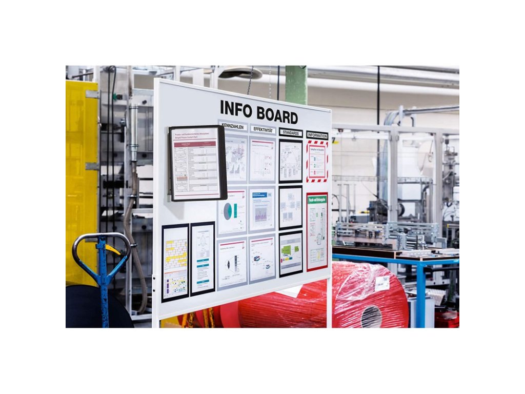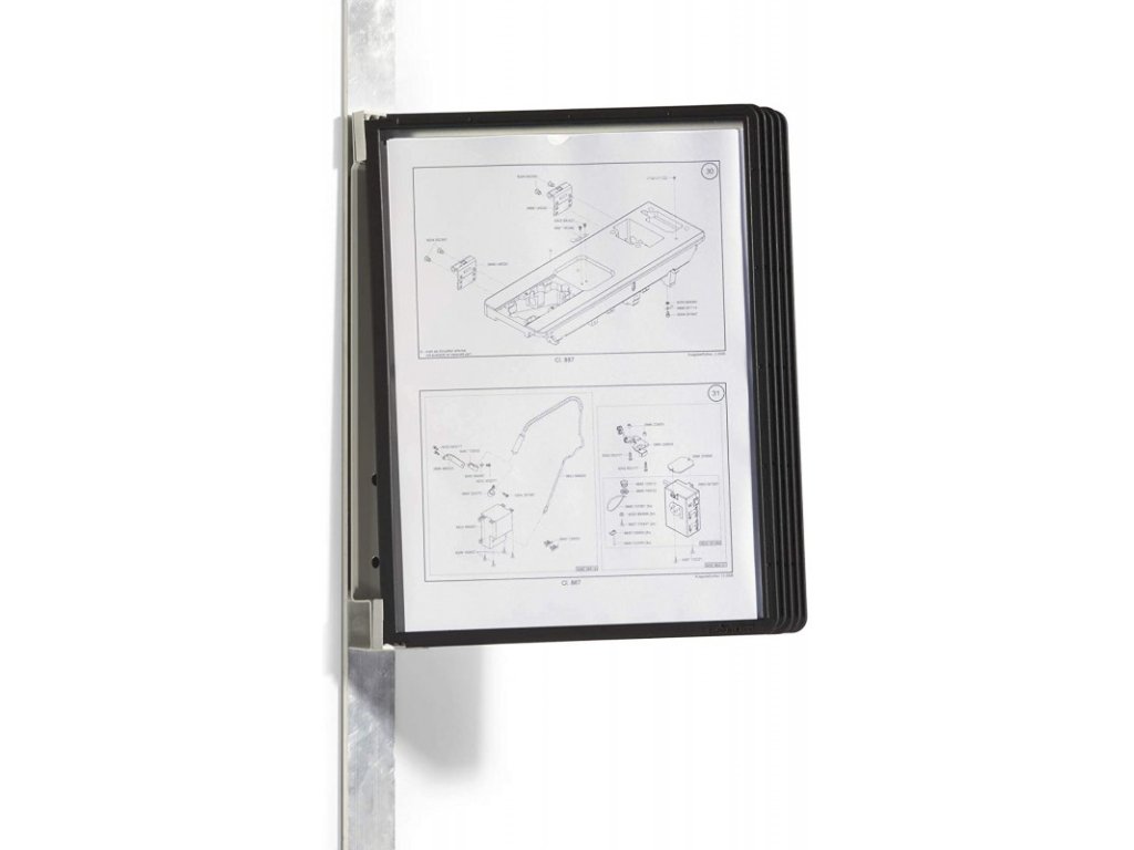 - Nástěnný systém - Magnetický nástěnný kovový držák a 5 tabulemi na dokumenty. S kolíkovou mechanikou pro snadnou výměnu.