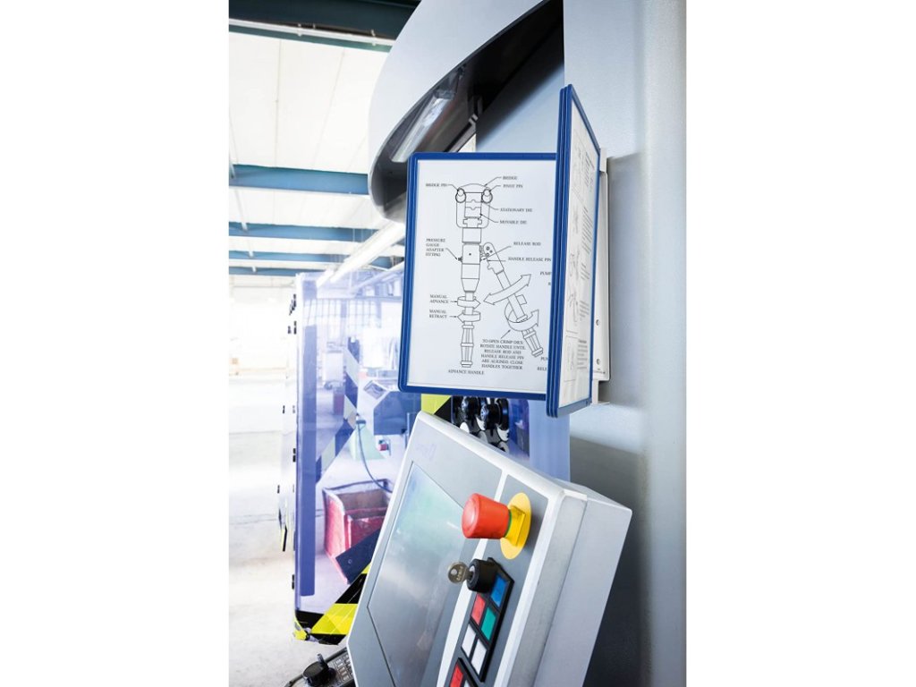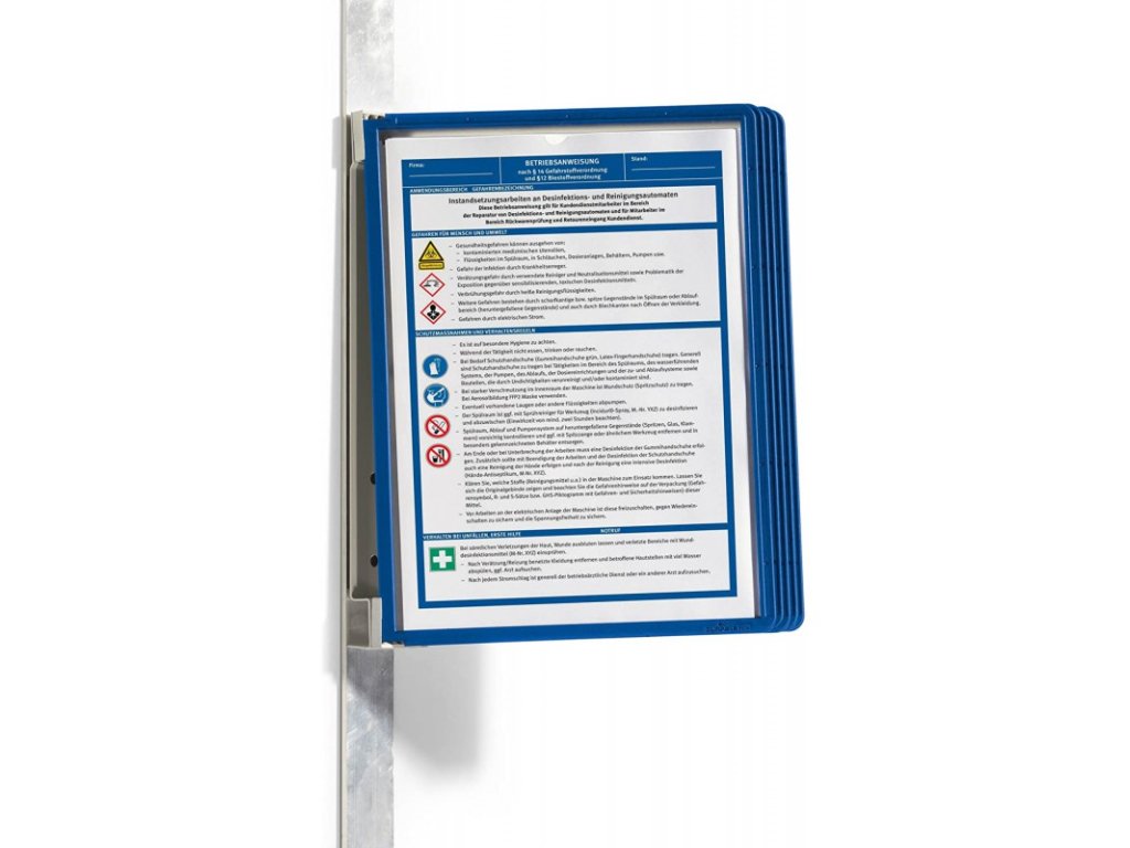 - Nástěnný systém - Magnetický nástěnný kovový držák a 5 tabulemi na dokumenty. S kolíkovou mechanikou pro snadnou výměnu.