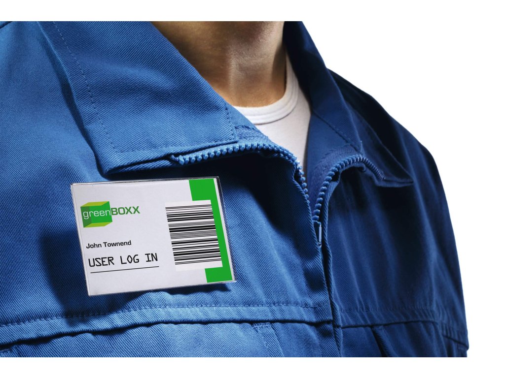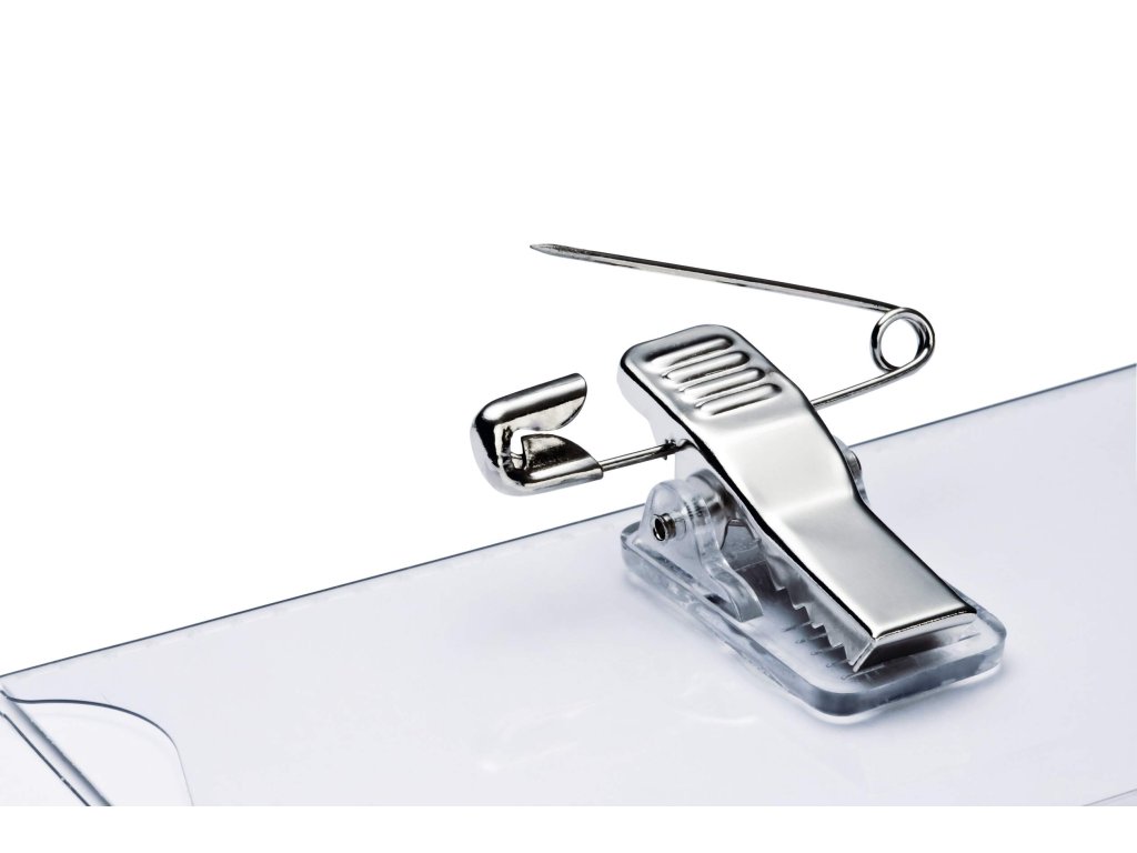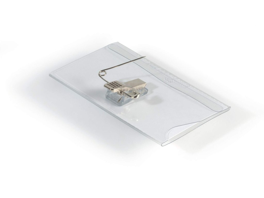 - Silná plastová jmenovka 54 x 90 mm s plochým špendlíkem na zadní straně.