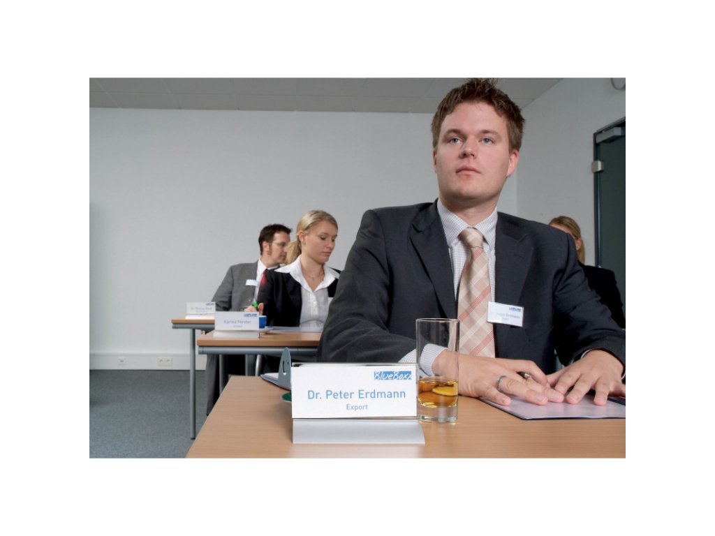 - Kvalitní stolní jmenovka z průzračného akrylu s hliníkovým stojanem.