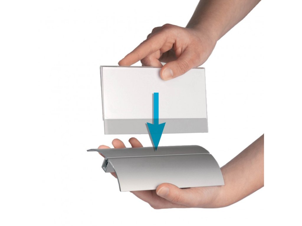 - Jedinečný svěrný systém pevně drží akrylový štítek a umožňuje snadnou výměnu vkládacího štítku.