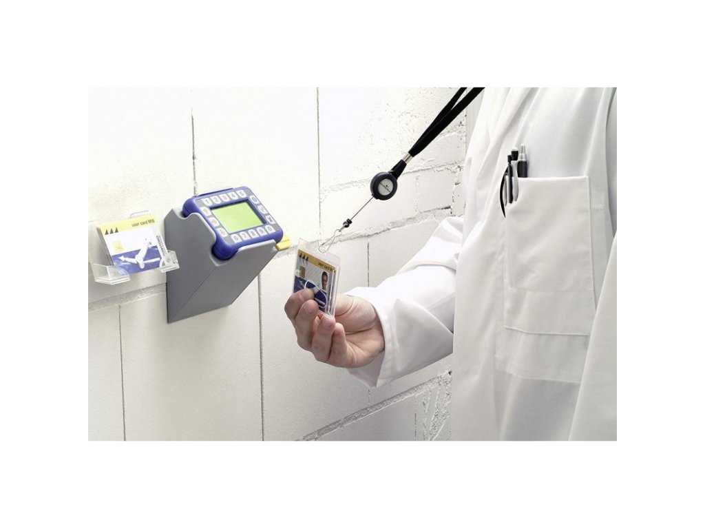 - Rolovací závěsný klip, délka roztažení 60 cm, na konci úchyt na vizitky nebo karty.