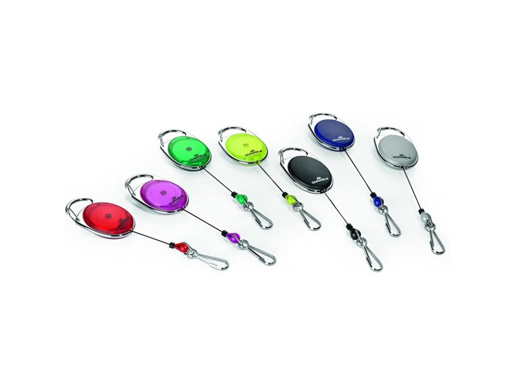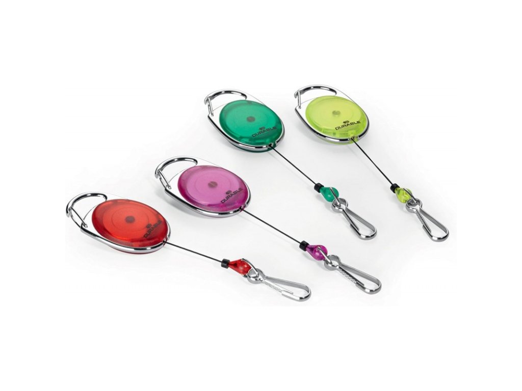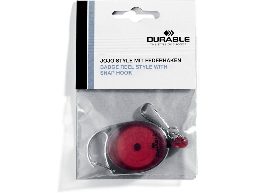 DURABLE 8327 STYLE, držák jmenovek s karabinou a klipem, navíječ pro ID karty, červený