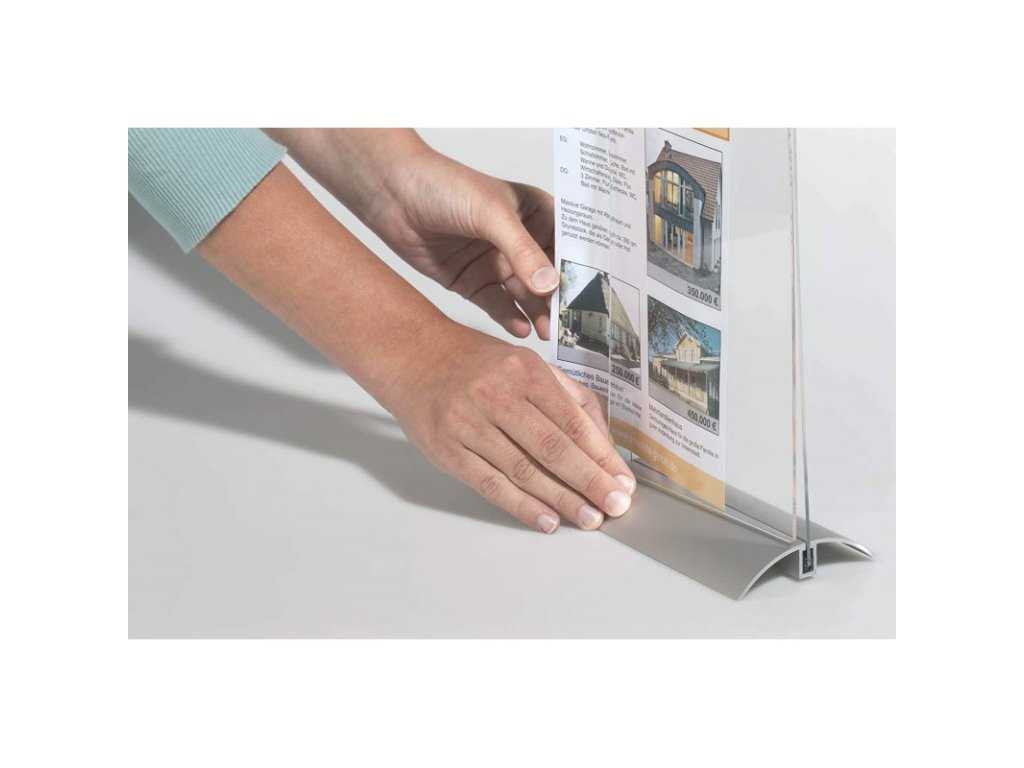 - Informace mohou být snadno vloženy, bez nutnosti vyjmutí acrylové desky z hliníkového podstavce. Jedinečný upínací systém desku pevně drží.