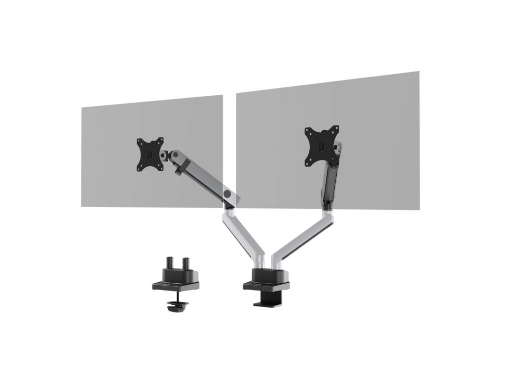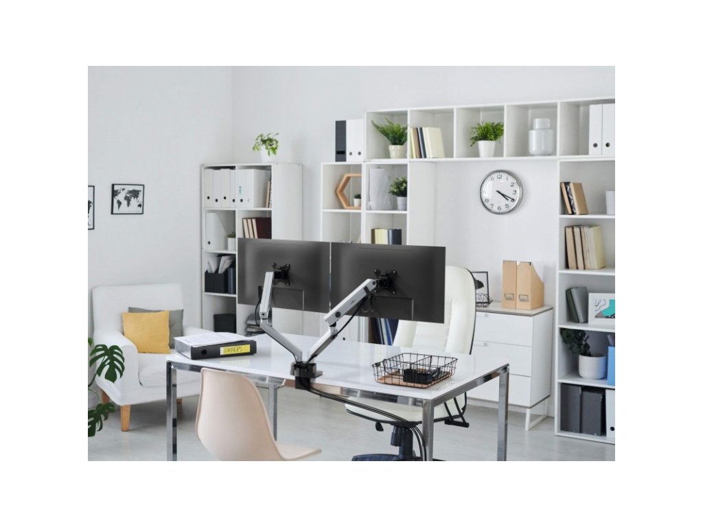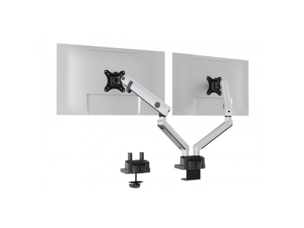 - Držák monitoru s flexibilními rameny pro 2 monitory včetně možnosti individuální montáže pomocí uchycení skrz stůl nebo stolní svorky