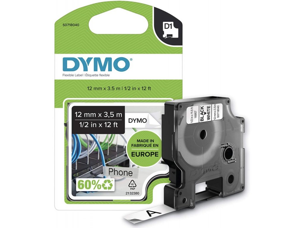 - Páska Dymo D1, 12mm (16957) bílá, černý tisk, 3,5m flexi nylonová - permanentní