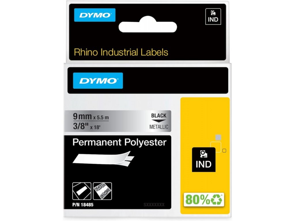 Dymo štítky 18485 permanentní polyesterová páska RHINO D1 9 mm x 5,5 m, černá na metalické