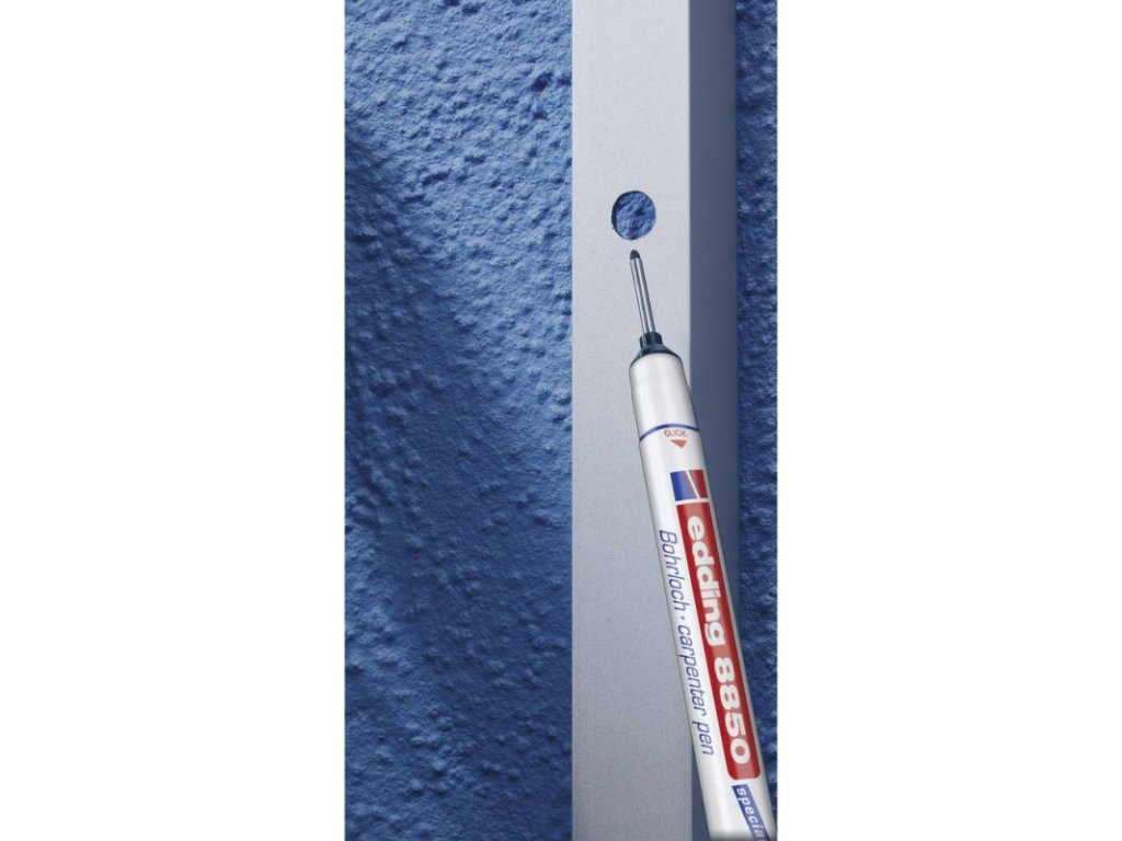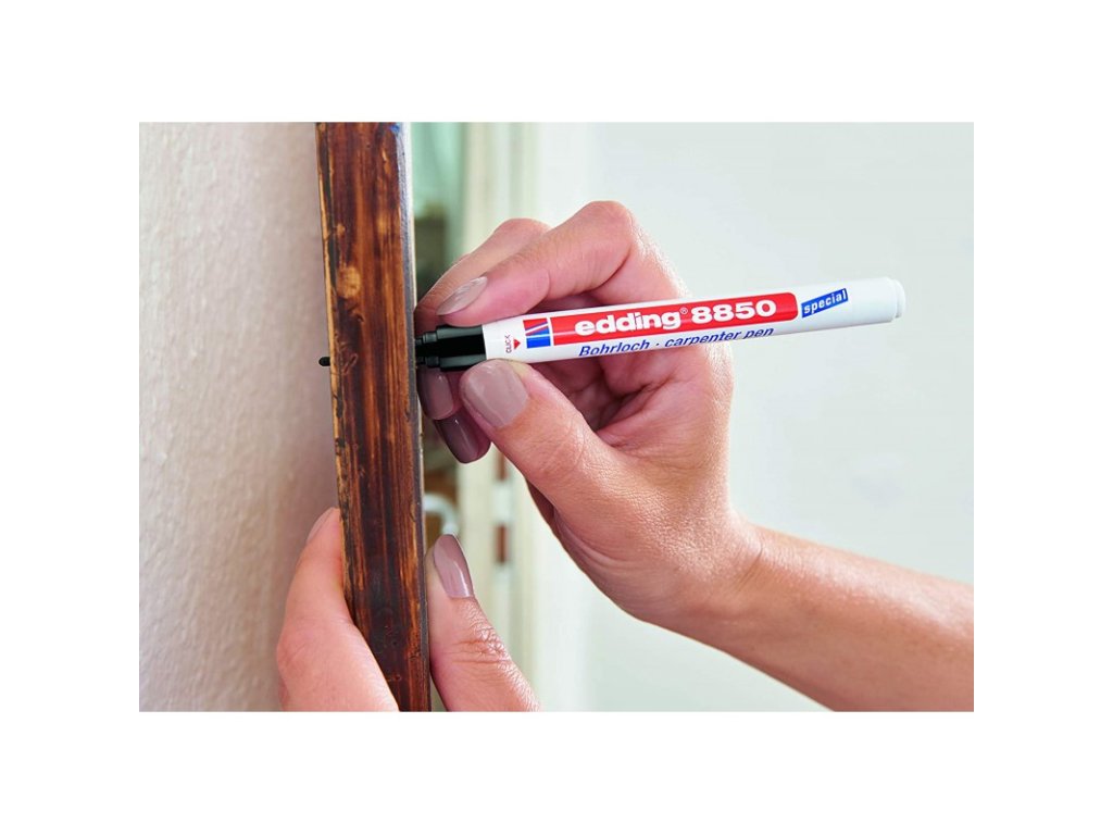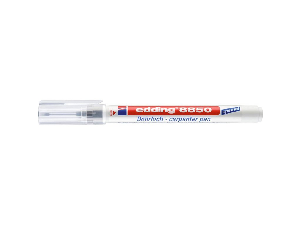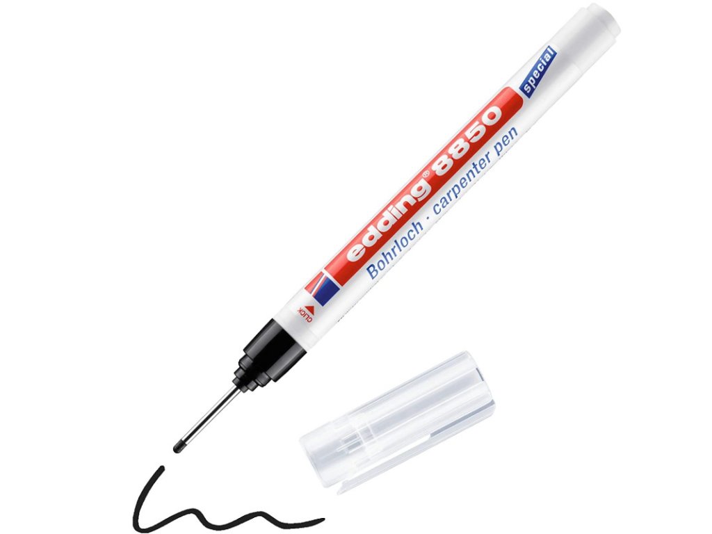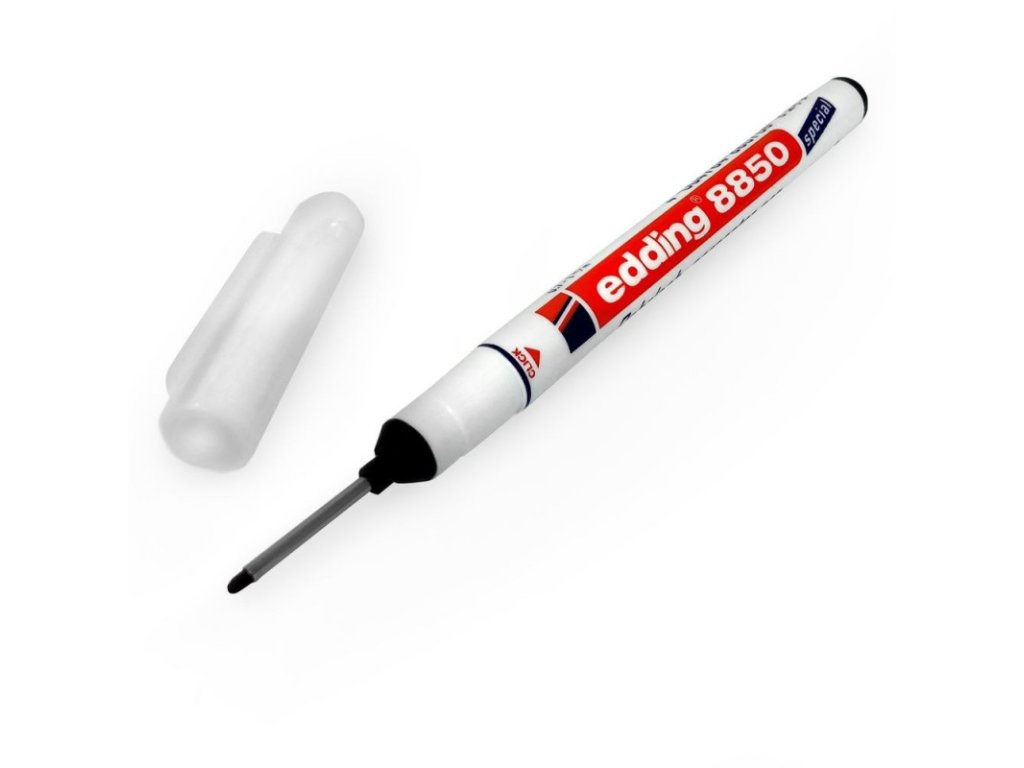 - Edding 8850 popisovač pro tesaře s velmi dlouhým a tenkým hrotem, obsahuje průhledné víčko a speciální permanentní inkoust