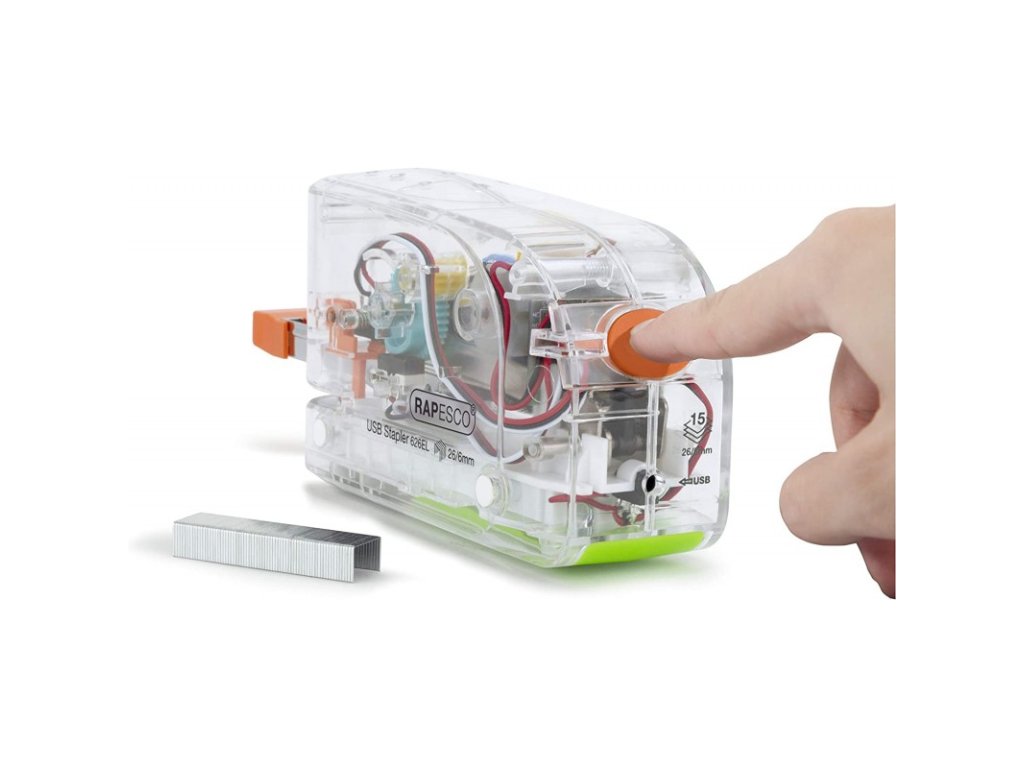 - Sešívačka "626EL", průhledná, 26/6, 15 listů, plast, USB nabíjení, RAPESCO