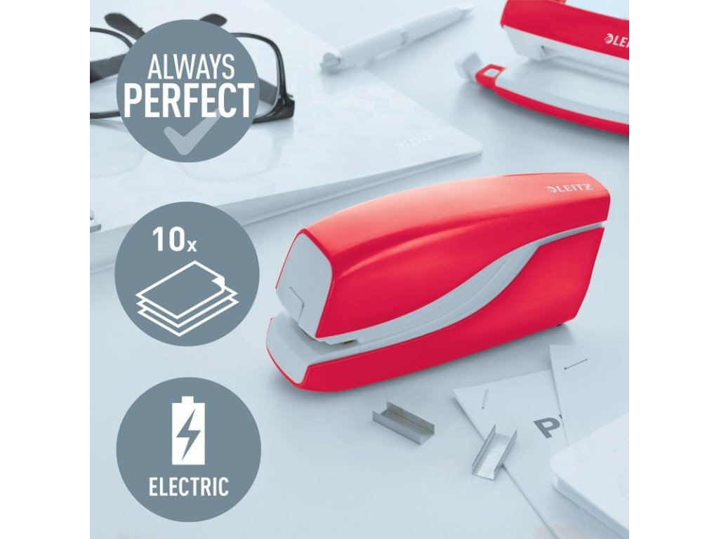 - Leitz WOW Electric Stapler, 10 Sheet Capacity, Battery Operated, Metallic Red, Includes 1000x E1 Staples, 55661026