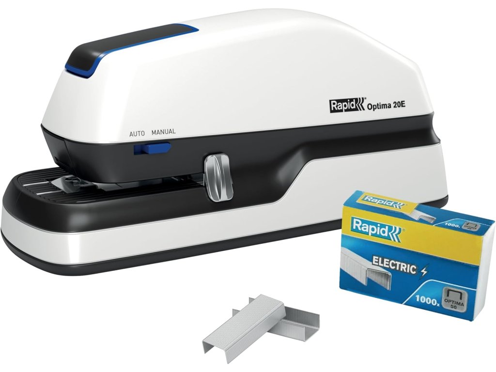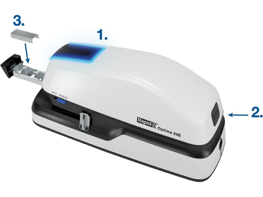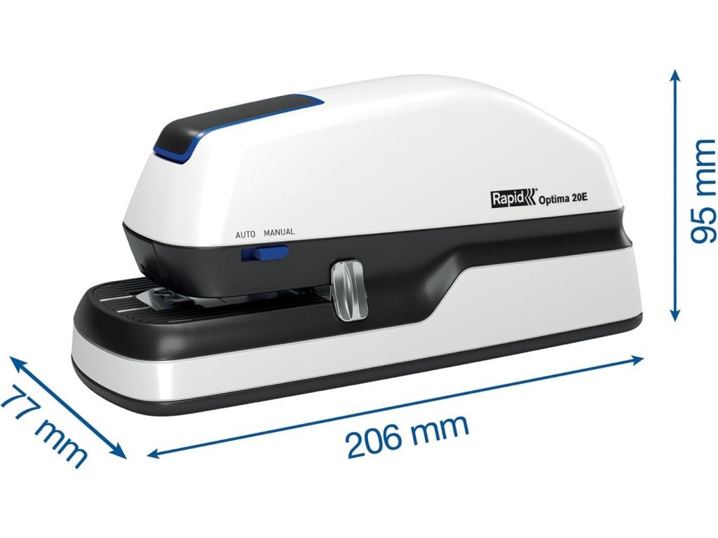 Elektrická sešívačka Rapid OPTIMA 20E umožňuje rychlé a pohodlné sešívání až 20 listů (80 g/m²) najednou – ideální pro kanceláře, recepce, pokladny i domácnosti. Nabízí automatický i manuální režim, hygienické bezkontaktní ovládání a spolehlivé sešívání bez zasekávání při použití drátků Optima 56.