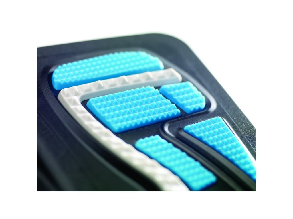Ergonomická podpěra nutí k aktivnímu sezení a končetiny nejsou ve strnulé poloze, tím podporuje žilní návrat krve k srdečnímu svalu a předchází bolestem zad. Podpěra chodidel je černé barvy s prvky modré a světle šedé.