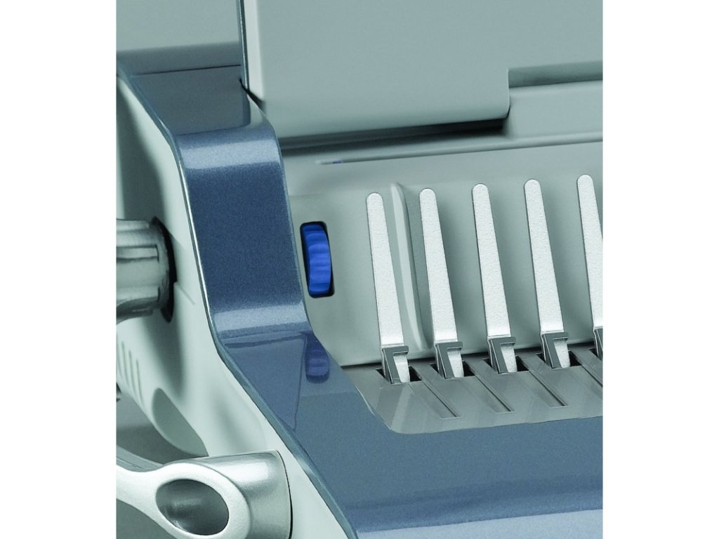 - Stroj je vybaven větším zásobníkem na uložení několika plastových hřbetů a integrovanou měrkou pro správnou volbu průměru hřbetu.
