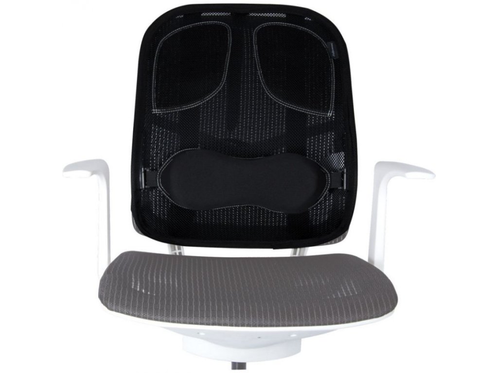 - Speciální podpěra vyrobená z paměťové pěny podepírá bederní část zad, možnost nastavení výšky usnadňuje přizpůsobení potřebám konkrétního uživatele