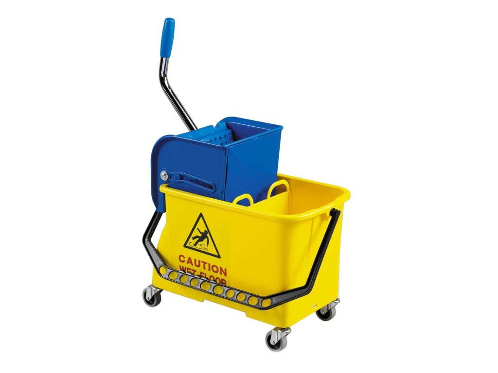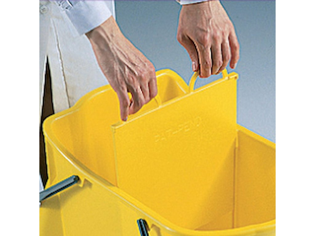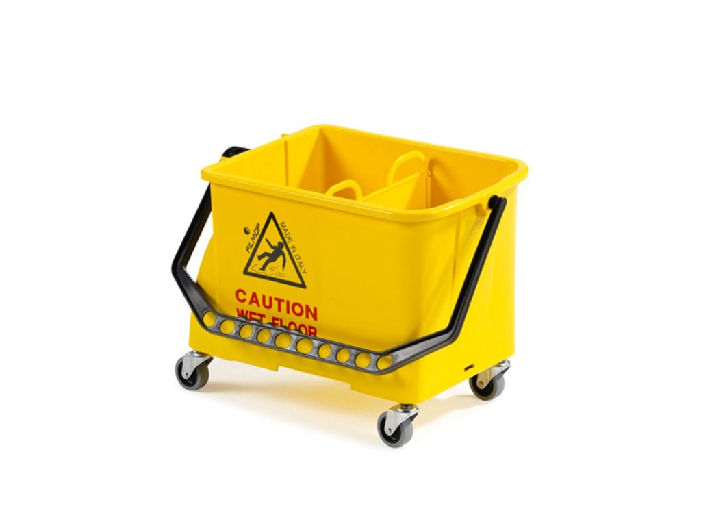 Úklidový vozík SPIDER je vybaven žlutým plastovým kbelíkem o objemu 15 litrů, rozděleným vyjímatelnou hermetickou přepážkou na dvě komory po 7,5 l – na čistý čisticí roztok a oplachovou vodu. Díky této separaci dosahuje obsluha vyšší úrovně hygieny a úspory vody i chemie. Součástí vozíku je také plastový boční lis pro ždímání mopu, ideální pro systémy s plochým mopem typu Speedy.