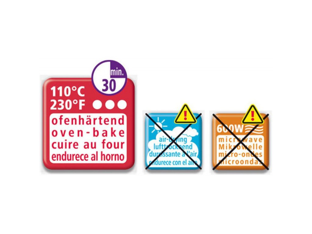 •vytvrzuje se pečením v troubě po dobu 30 minut při 110 C°, připraveno k hraní jakmile vychladne