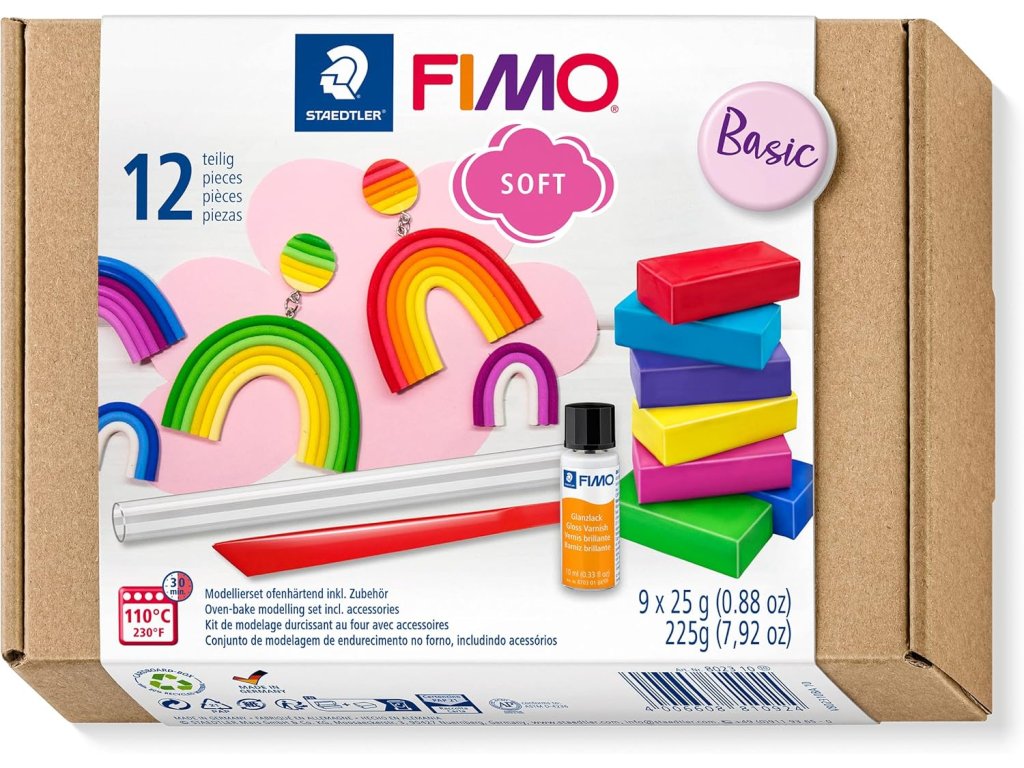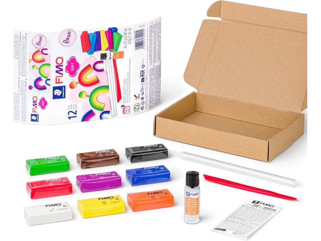 - 9 půlbloků FIMO Soft 25 g - bílá, žlutá, červená, oranžová, fialová, modrá, zelená, hnědá a černá, 1 x FIMO lak 10 ml, modelovací pomůcky