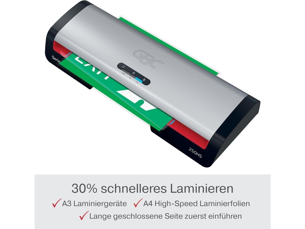 - vysokorychlostní laminátory GBC zkracují dobu laminace o 33 % při použití laminovacích kapes GBC pro rychlou laminaci