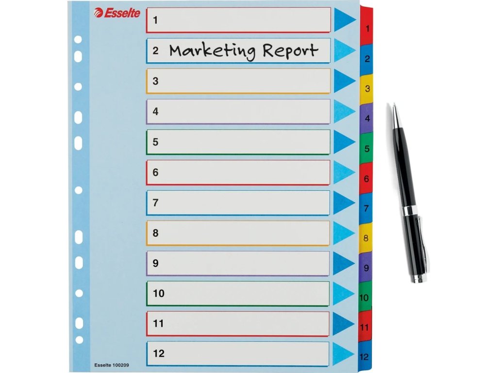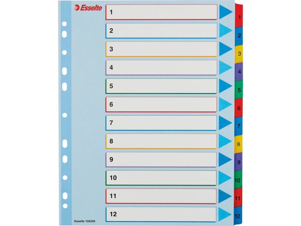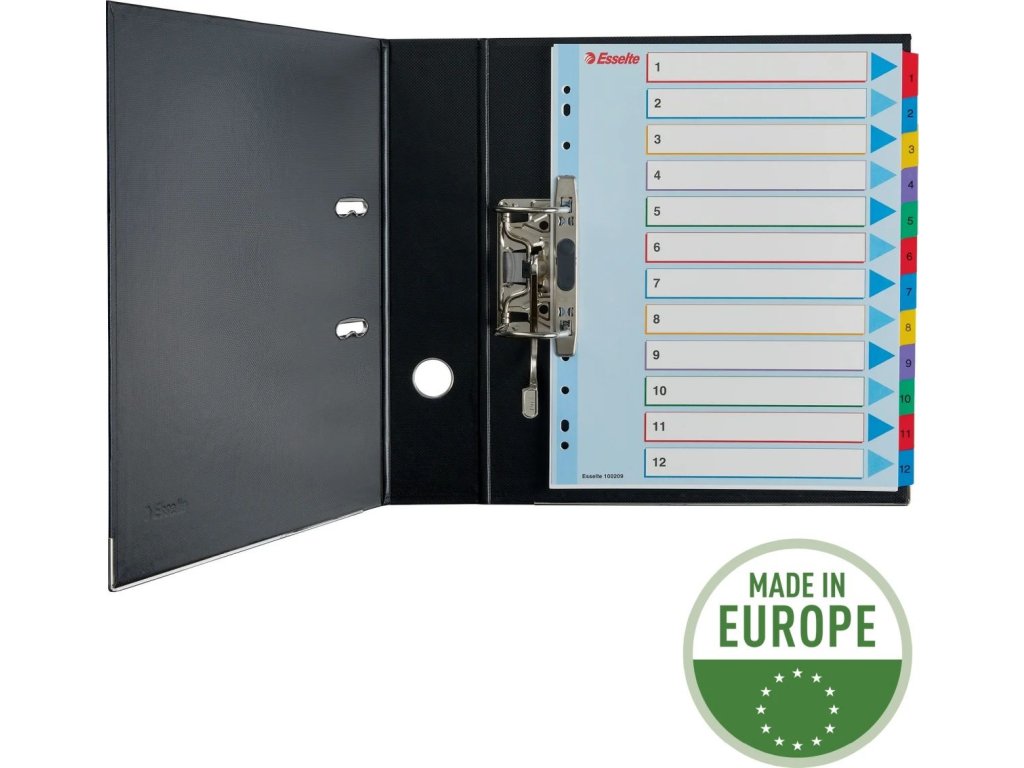 - 12 barevných dělicích listů se štítky 1-12 pro rychlou orientaci v obsahu