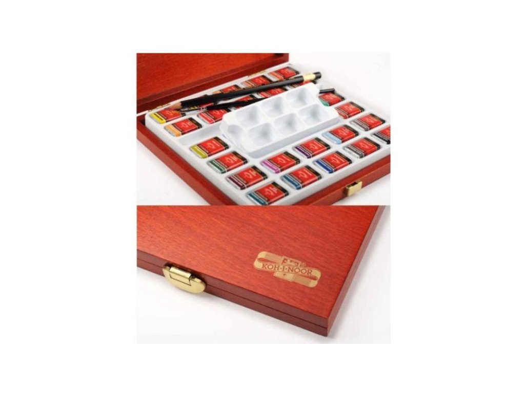 - Tato sada barev Koh-I-Noor je dodávána v atraktivní dřevěné krabici a dodává se s doplňky, které pomáhají vašemu umění, jako je štětec, tužka a paleta