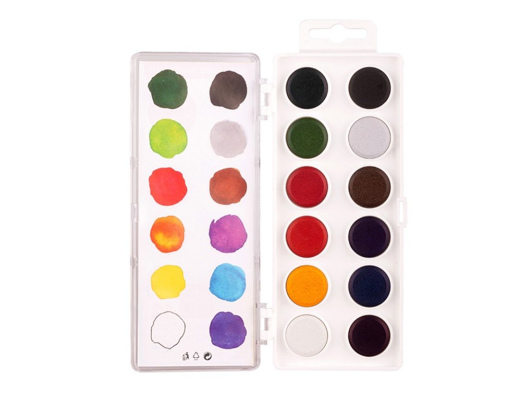 - Vodové barvy o průměru tablet 22,5 mm s 12ti brilantními odstíny vhodné pro speciální výtvarné techniky, např. pro kolorování fotografií, malby portrétů, malbě na dekorační předměty, zdobení kraslic aj..