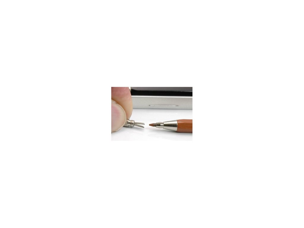- Tuha se posunuje stisknutím knoflíku hrotítka v nakloněné poloze tužky, tím dojde k otevření kleštiny a vysunutí tuhy.