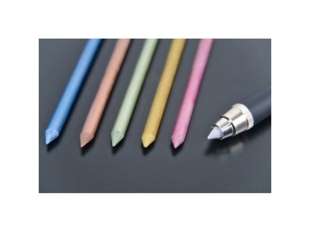 - Tužka je vložena do tvarové vložky, vedle tužky je 5 tuh pr. 5,6 mm v barvě metalízy bronzové, modré, zelené, zlaté a růžové, vše je v plastovém pouzdru s transparentním víkem.