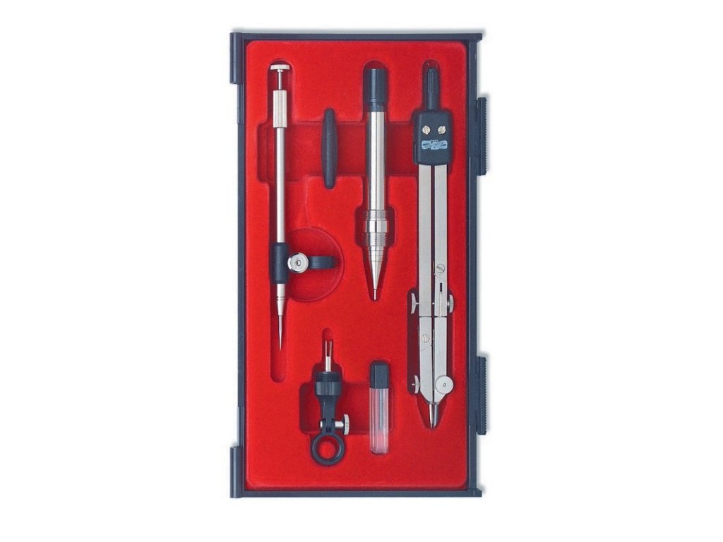 - Souprava, 6 dílná, se skládá z kružidla kovového s teleskopem, padacího nulátka pro trubičková pera, tuženky s jednou tuhou, nástavce kružidla, automatické tužky a šroubováku s držákem a slouží pro rýsování kružnic o průměru v rozsahu 1-450 mm.